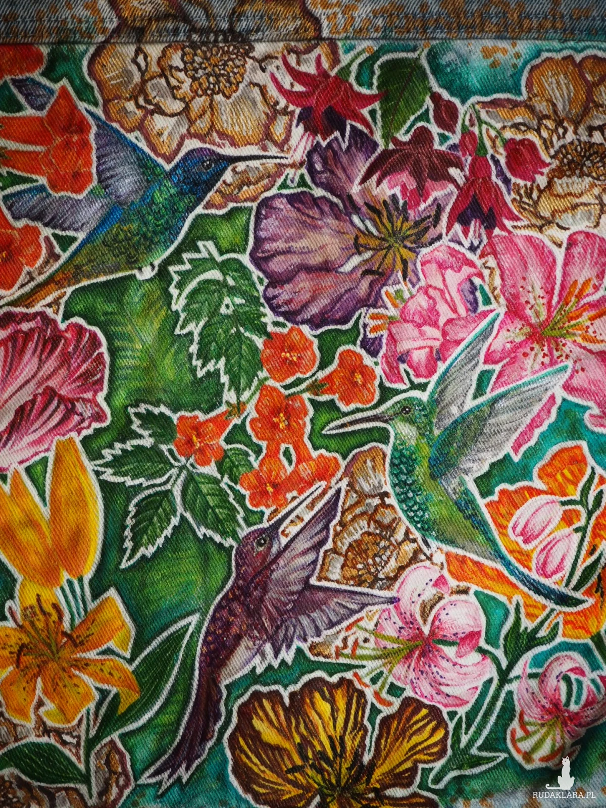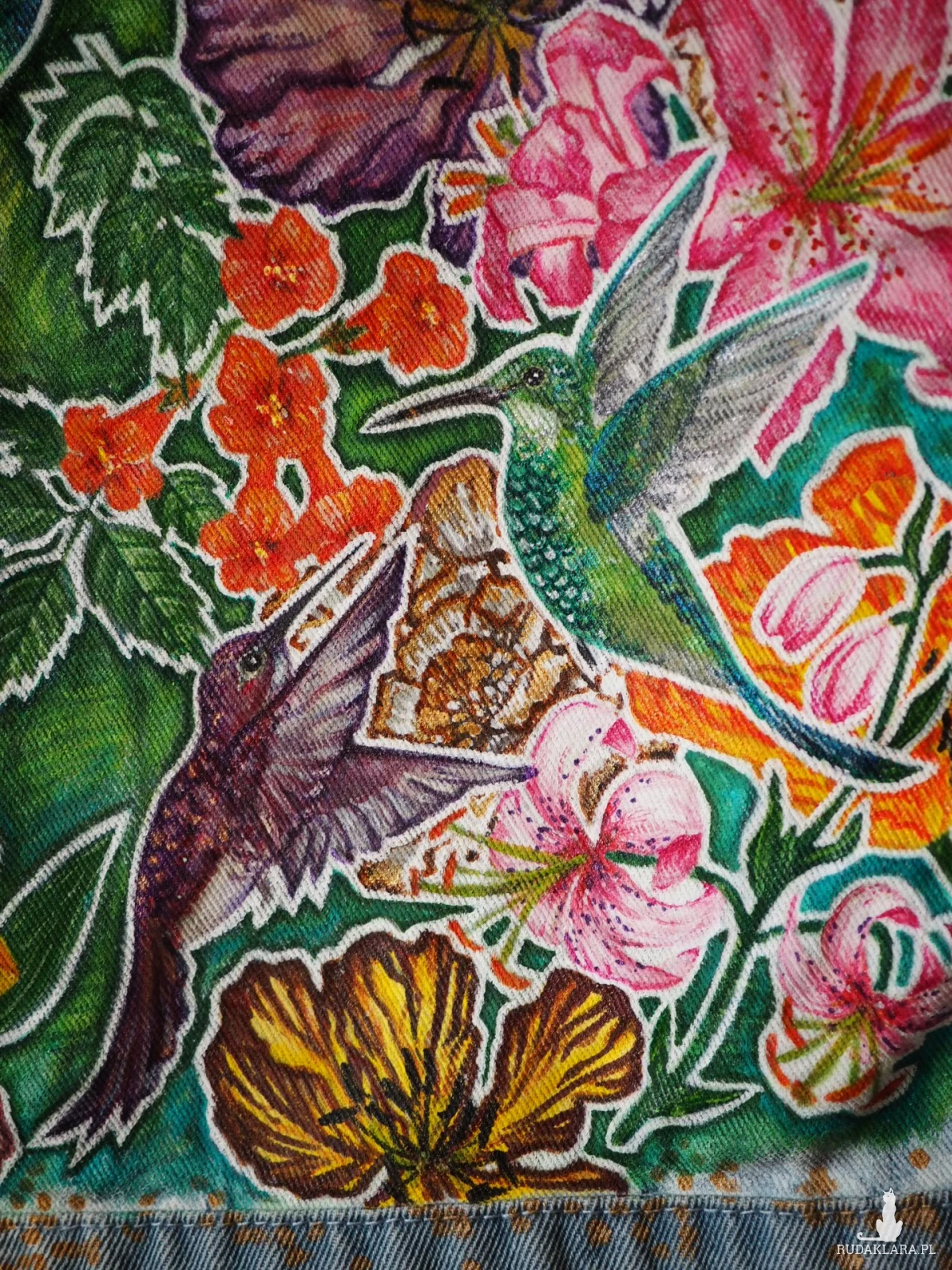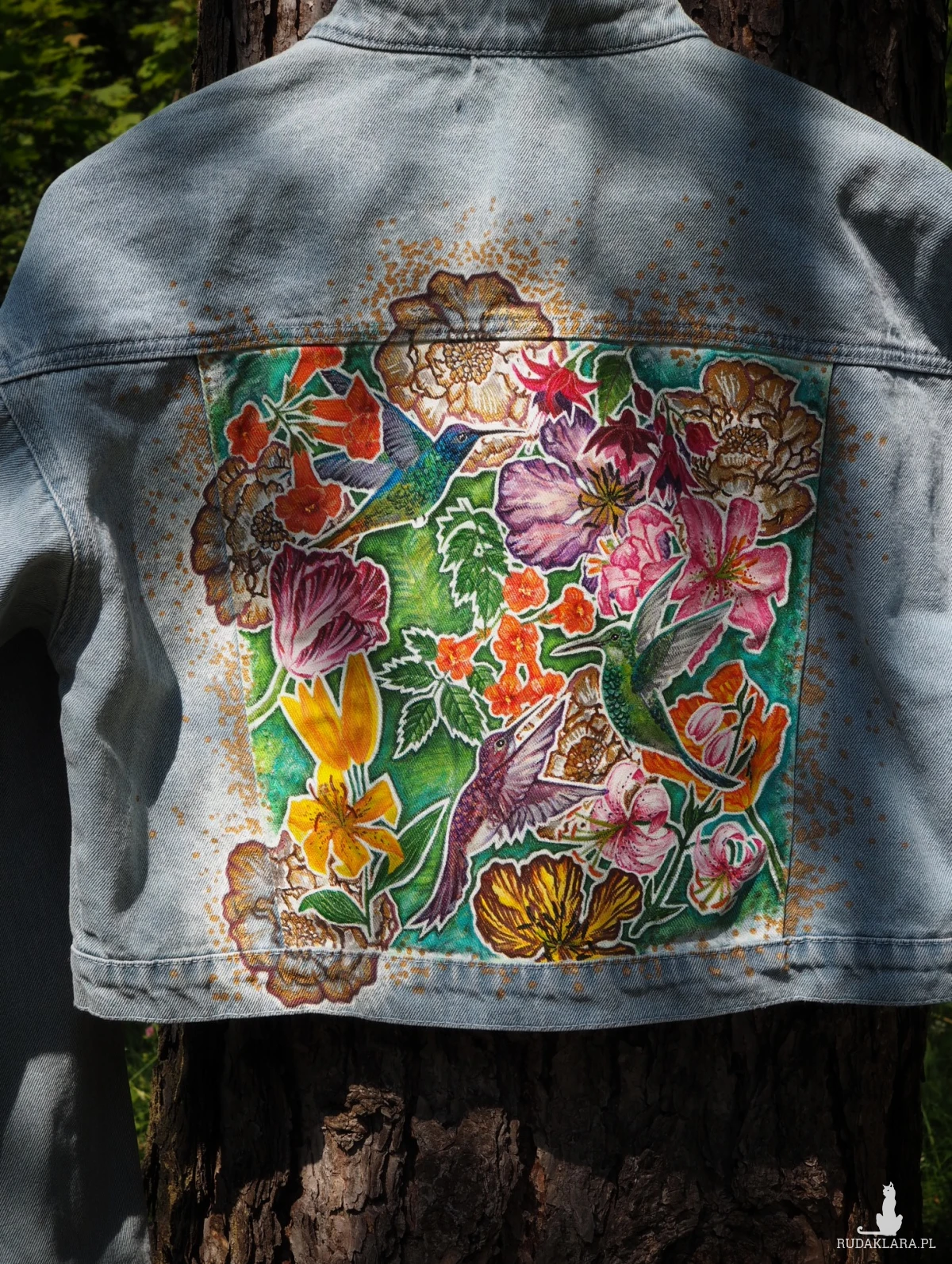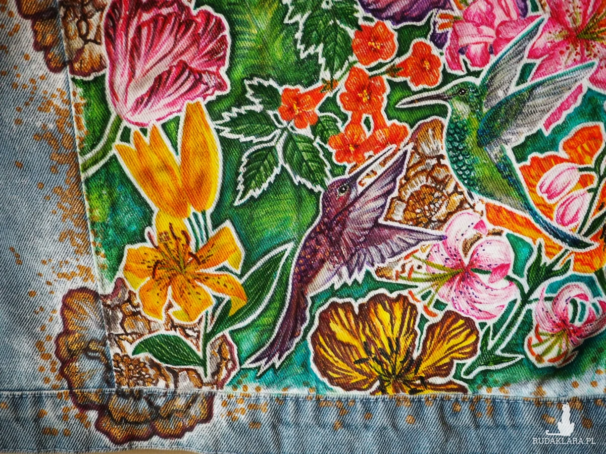 Wzór wykonany został przy użyciu najwyższej jakości akrylowych farb do tkanin, dzięki czemu jest trwały i wodoodporny. Kurtkę można prać w temp. do 30 stopni.