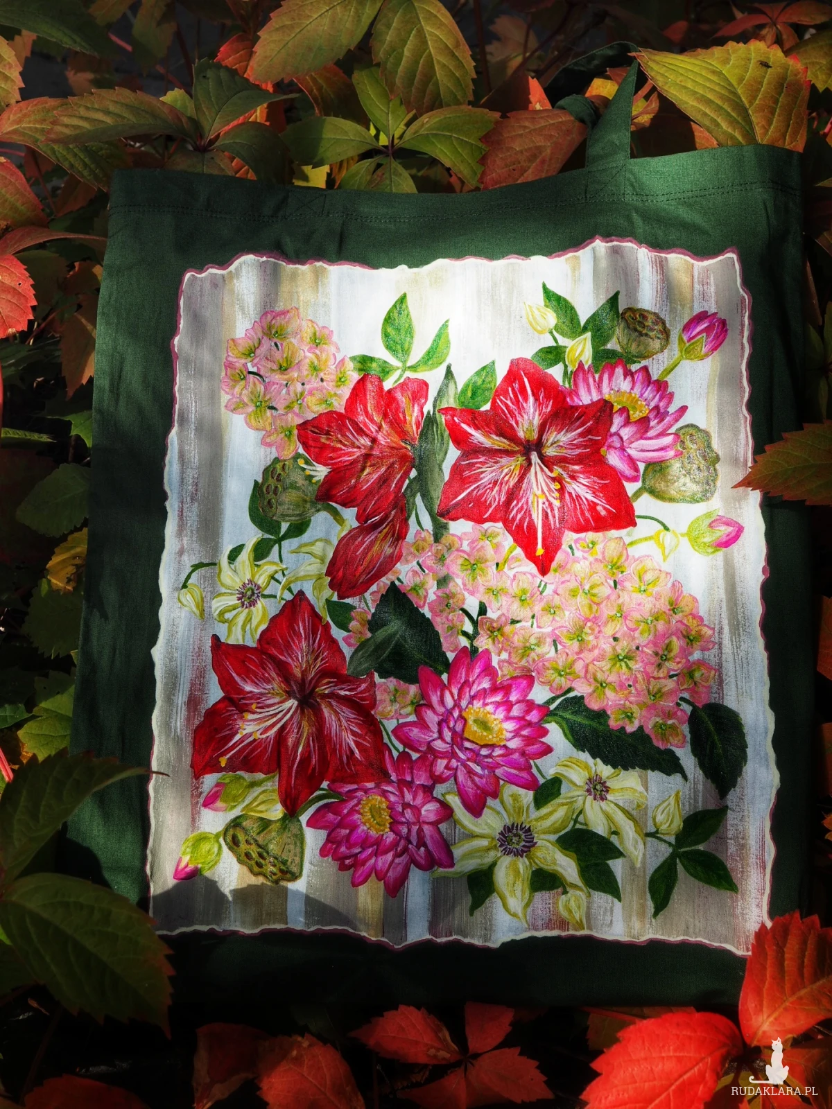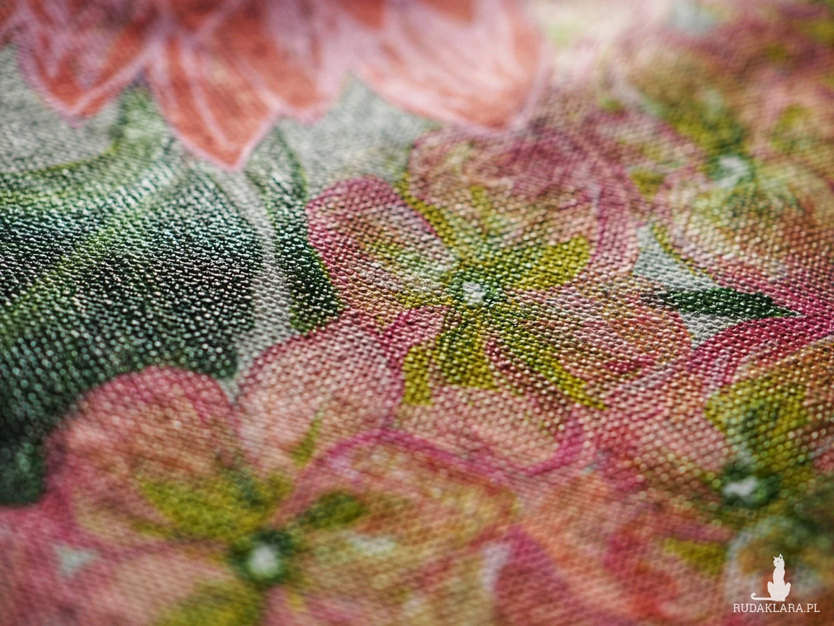 Ręcznie malowana (nie drukowana) tekstylna torba bawełniana z egzotycznym motywem kwiatowym. Torba na zakupy z uchwytami o długości 66 cm.