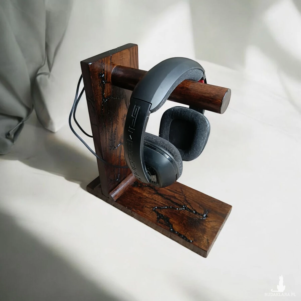 Drewniany stojak na słuchawki wykonany z litego dębu w technice Lichtenberga to połączenie rzemiosła stolarskiego z kontrolowanym efektem wyładowań elektrycznych. Forma jest prosta i ergonomiczna – stabilna podstawa przechodzi w smukły, wyprofilowany wspornik, który bezpiecznie podtrzymuje walec który tworzy ramię które nie deformując konstrukcji słuchawek.
