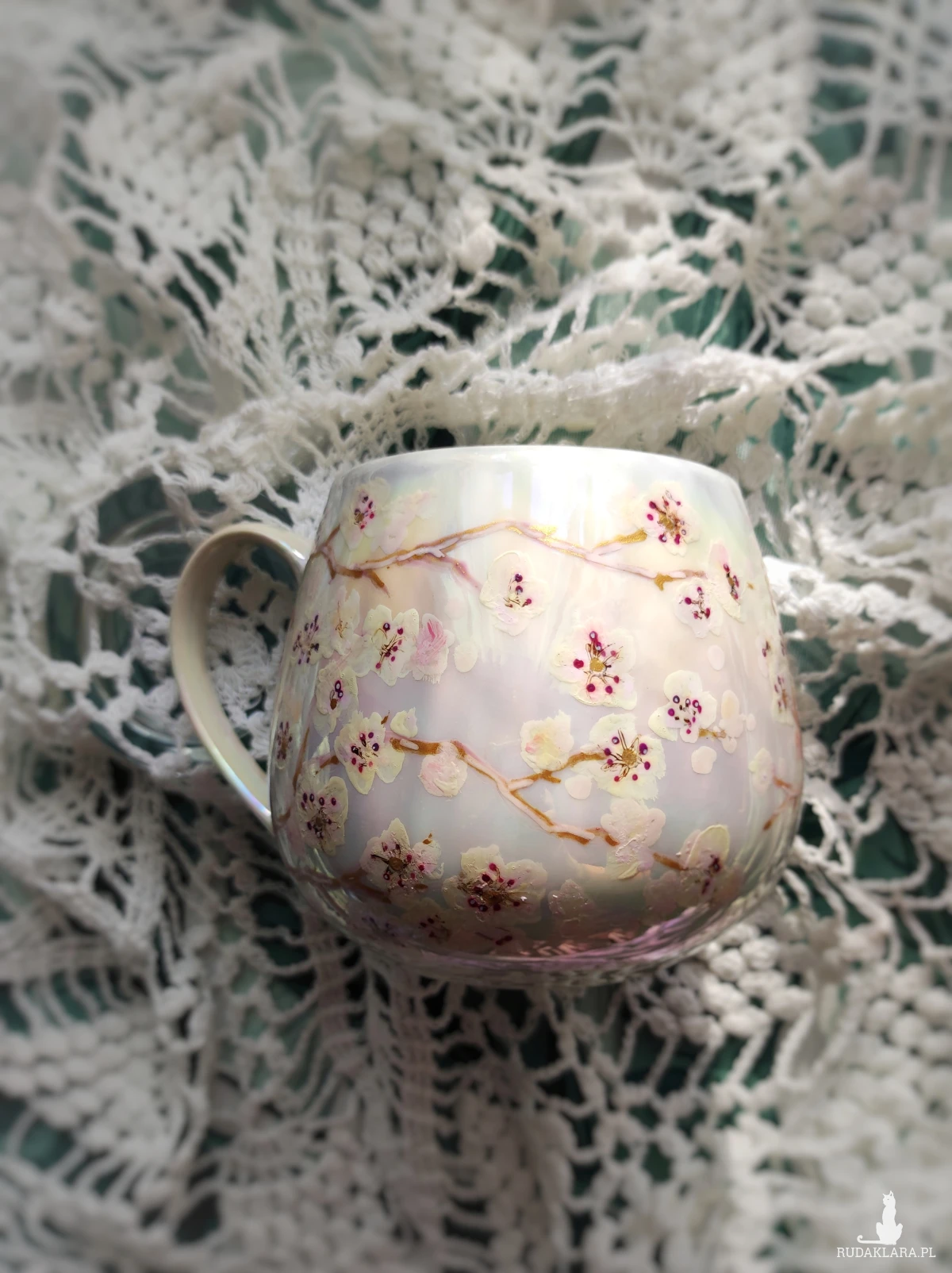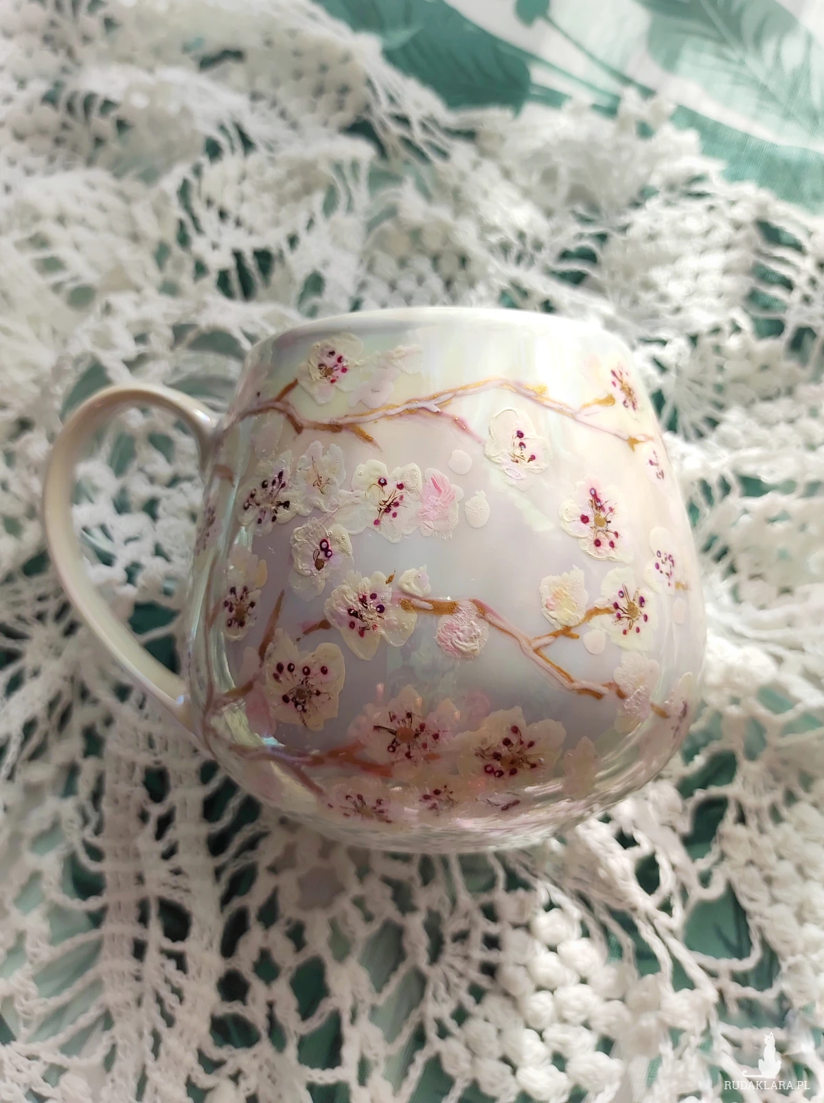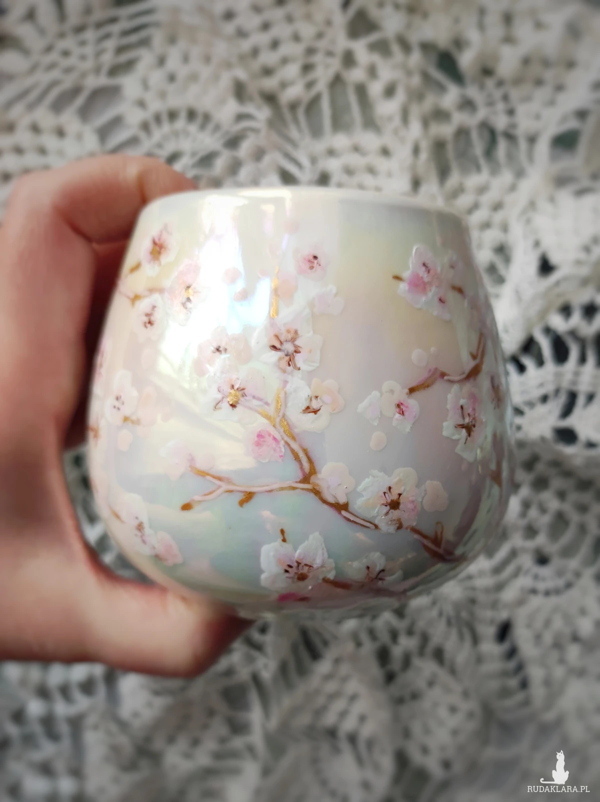 Ręcznie malowany kubek w pastelowych kolorach, z kwiatowym wzorem będzie doskonałym podarunkiem dla osoby kochającej wyjątkowe przedmioty. Możesz go wręczyć osobie, której obecność w swoim życiu szczególnie doceniasz, jako wyraz przyjaźni czy miłości. Wzór wykonany został przy użyciu nietoksycznych farb do porcelany, jest wodoodporny - naczynie może być myte ręcznie, bez użycia ostrych narzędzi. Powierzchnia kubka delikatnie perłowo opalizuje.