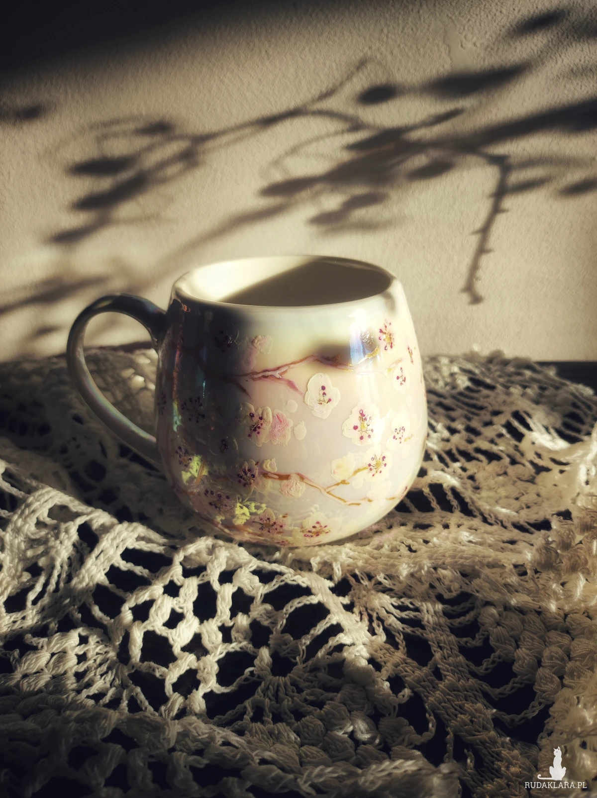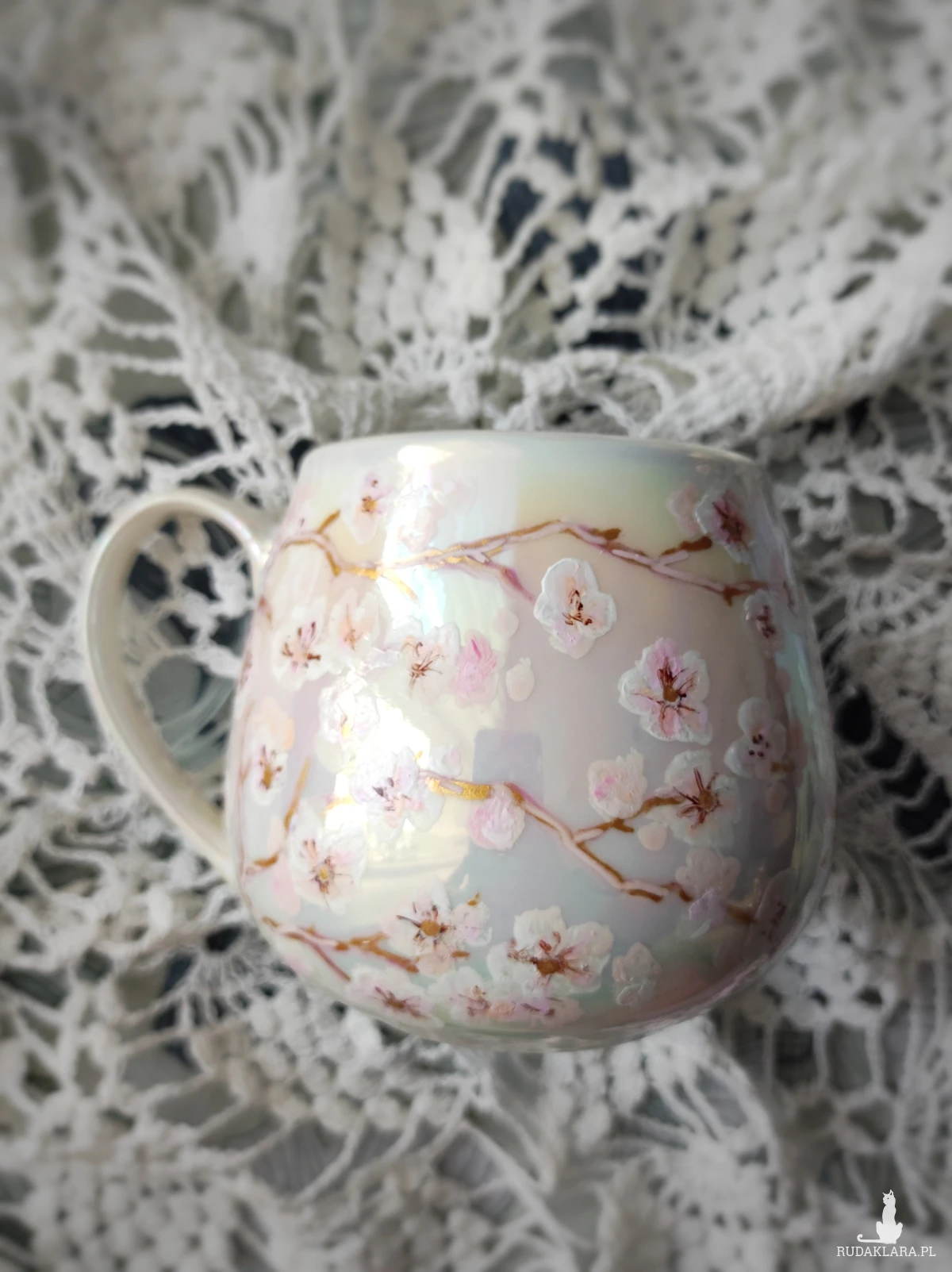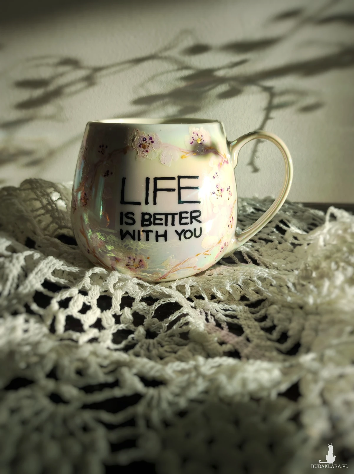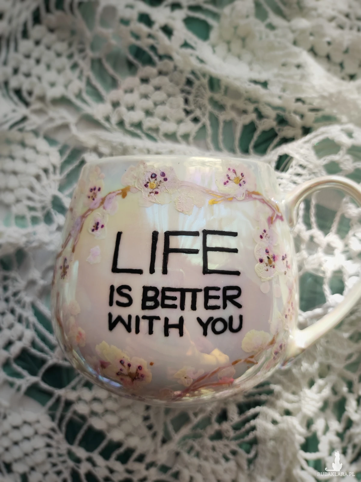 Ręcznie malowany kubek w pastelowych kolorach, z kwiatowym wzorem będzie doskonałym podarunkiem dla osoby kochającej wyjątkowe przedmioty. Możesz go wręczyć osobie, której obecność w swoim życiu szczególnie doceniasz, jako wyraz przyjaźni czy miłości. Wzór wykonany został przy użyciu nietoksycznych farb do porcelany, jest wodoodporny - naczynie może być myte ręcznie, bez użycia ostrych narzędzi. Powierzchnia kubka delikatnie perłowo opalizuje.