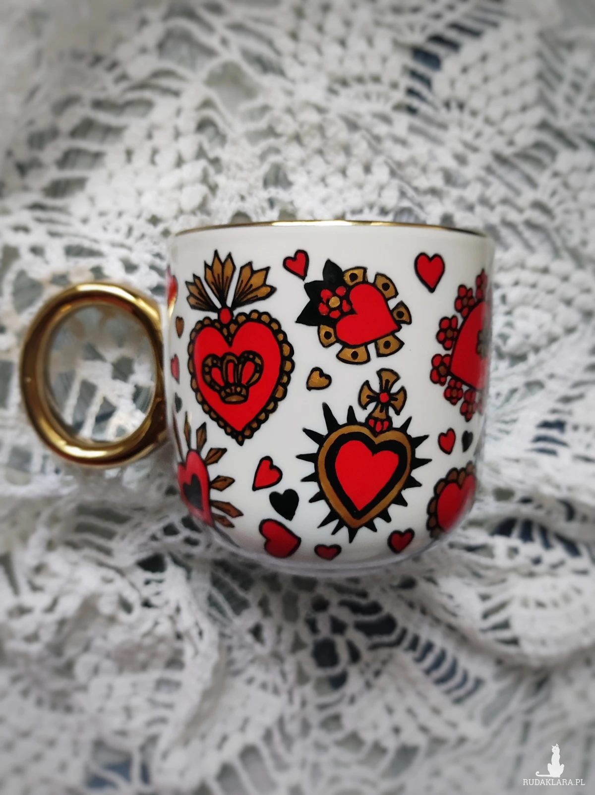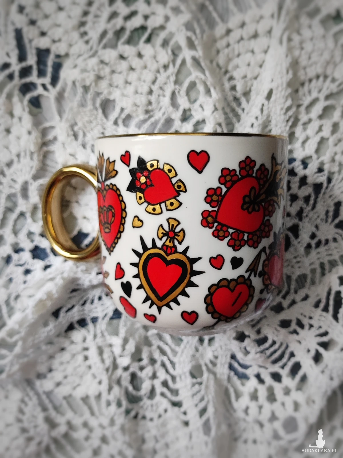 Ręcznie malowany kubek w żywych kolorach, z oryginalnym wzorem będzie doskonałym podarunkiem dla osoby kochającej oryginalne przedmioty. Wzór wykonany został przy użyciu nietoksycznych farb do porcelany, jest wodoodporny - naczynie może być myte ręcznie, bez użycia ostrych narzędzi.