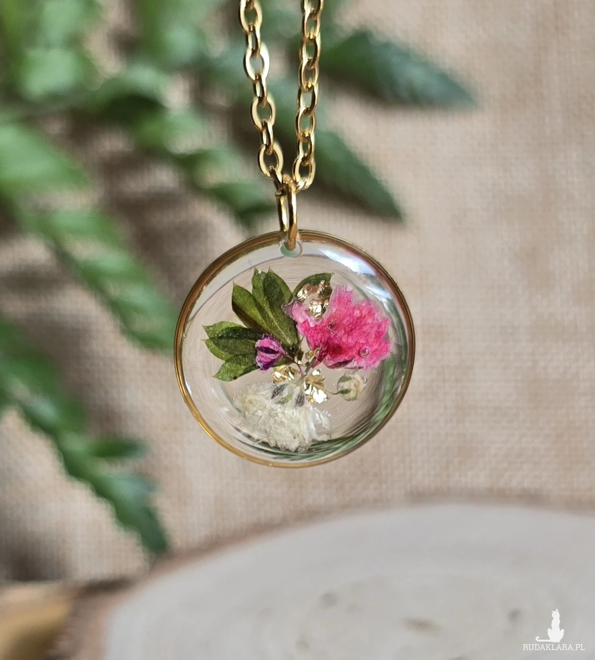 .Oferuję Państwu unikalną biżuterię. Zawieszka jest wykonana z suszonych kwiatów i żywicy epoksydowej. Biżuteria jest wspaniałym i oryginalnym prezentem na lata.