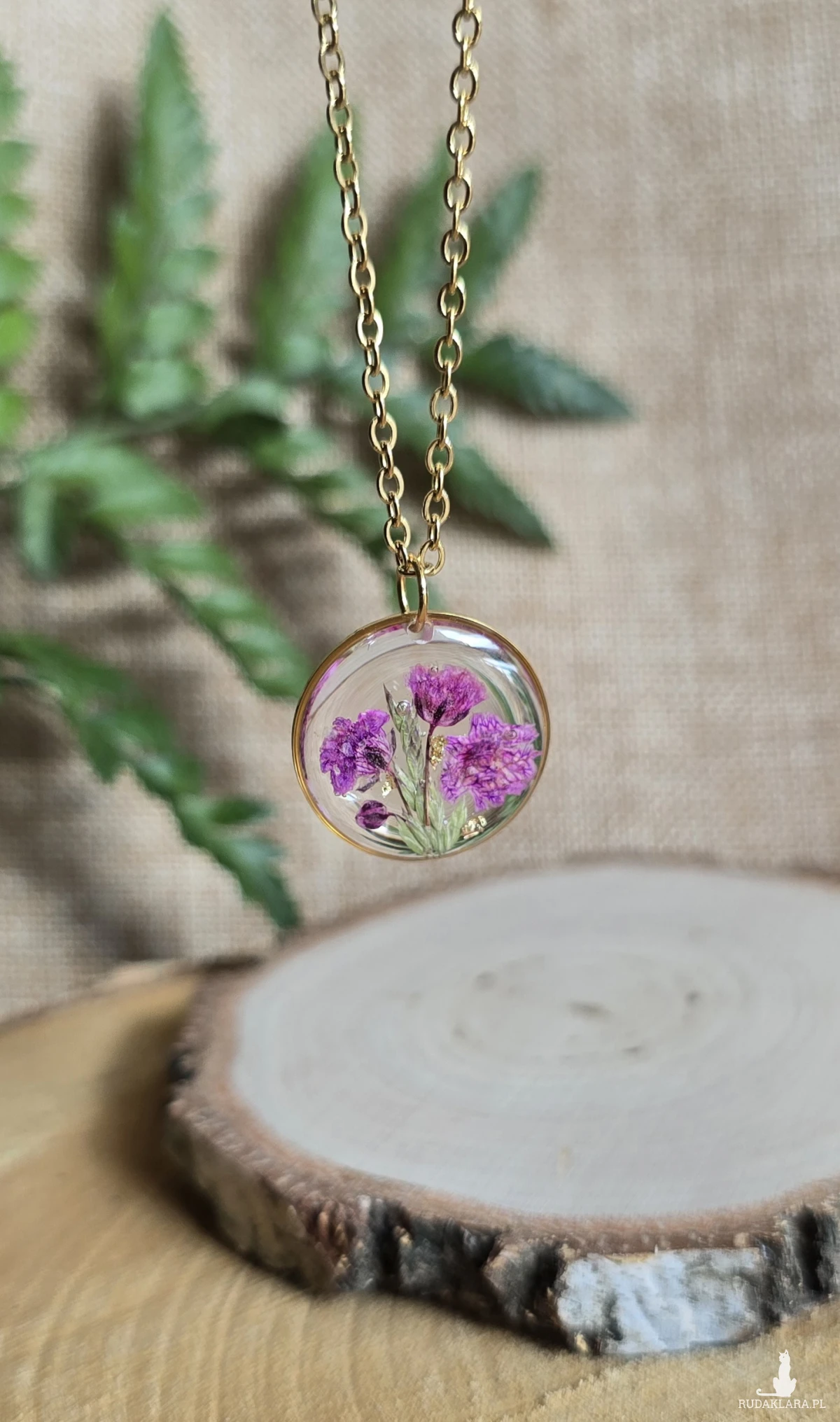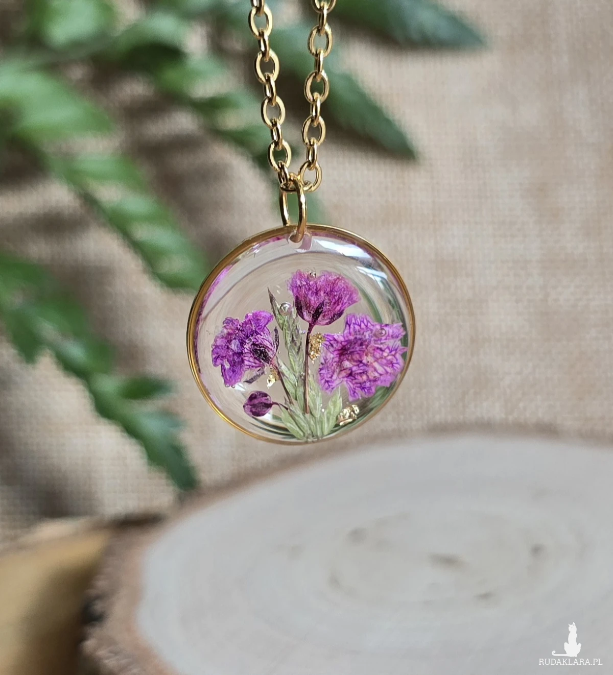 .Oferuję Państwu unikalną biżuterię. Zawieszka jest wykonana z suszonych kwiatów i żywicy epoksydowej. Biżuteria jest wspaniałym i oryginalnym prezentem na lata.