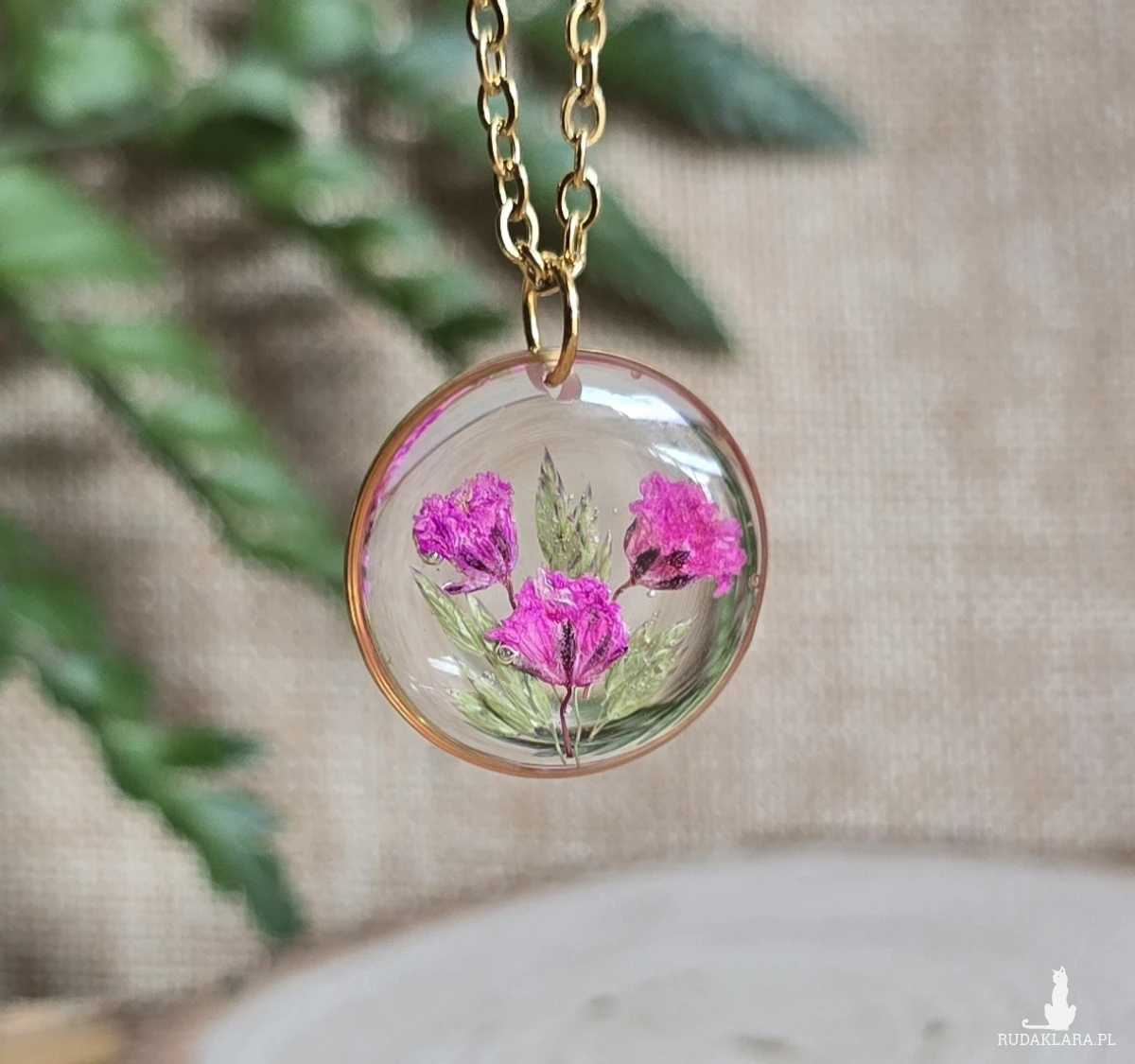 .Oferuję Państwu unikalną biżuterię. Zawieszka jest wykonana z suszonych kwiatów i żywicy epoksydowej. Biżuteria jest wspaniałym i oryginalnym prezentem na lata.