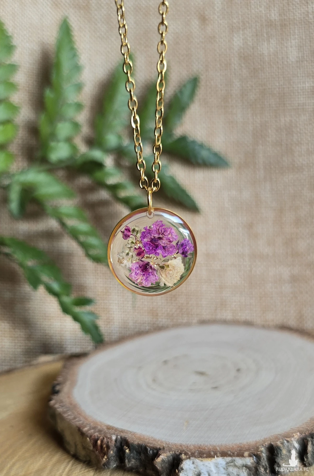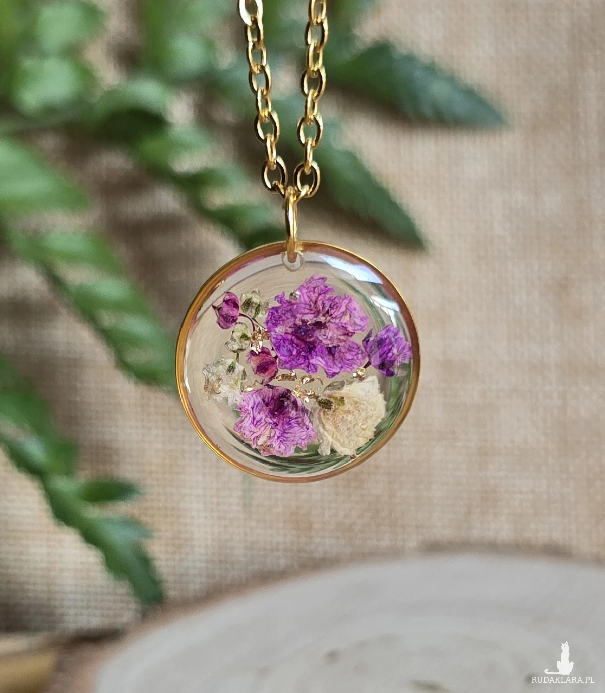 .Oferuję Państwu unikalną biżuterię. Zawieszka jest wykonana z suszonych kwiatów i żywicy epoksydowej. Biżuteria jest wspaniałym i oryginalnym prezentem na lata.