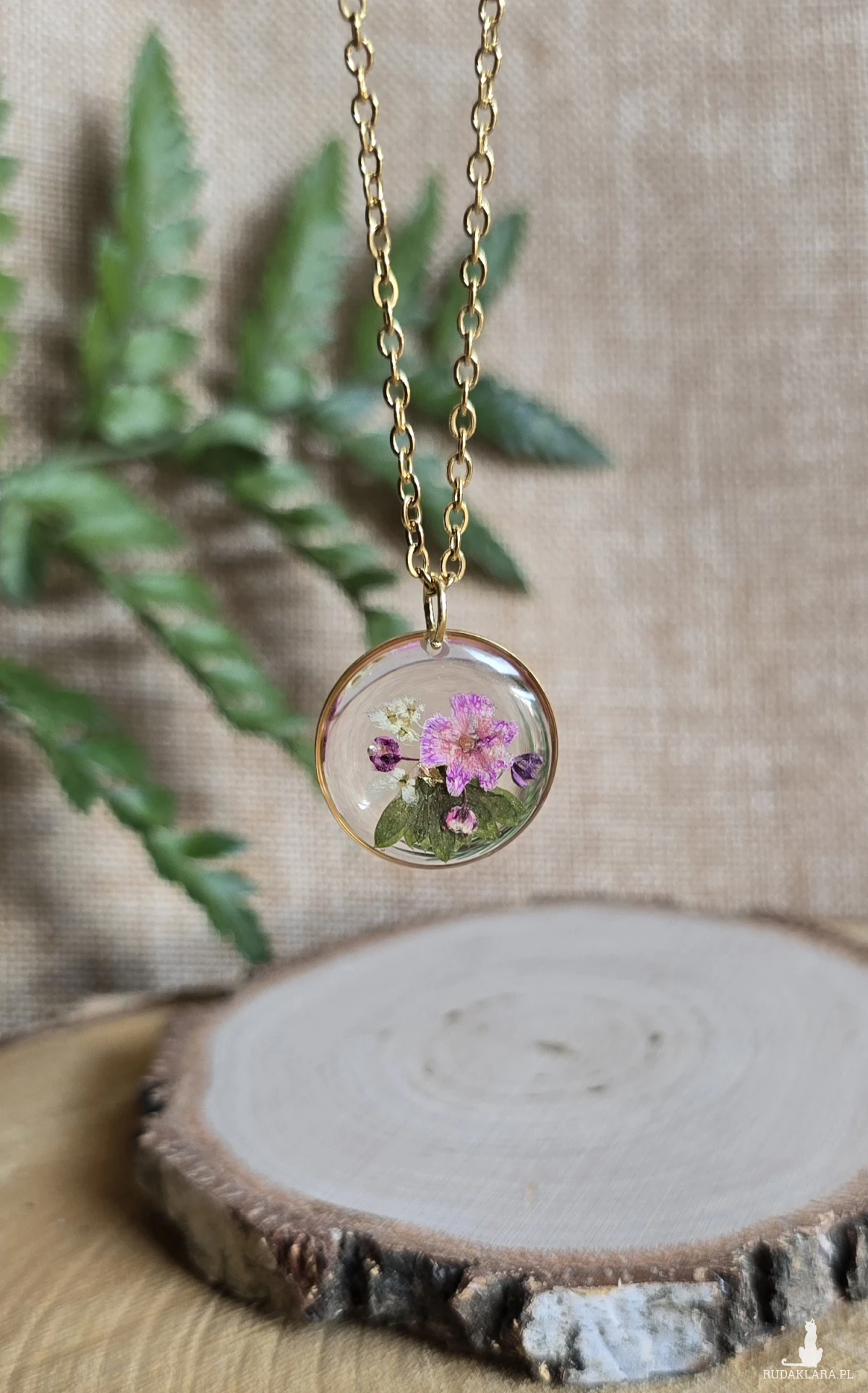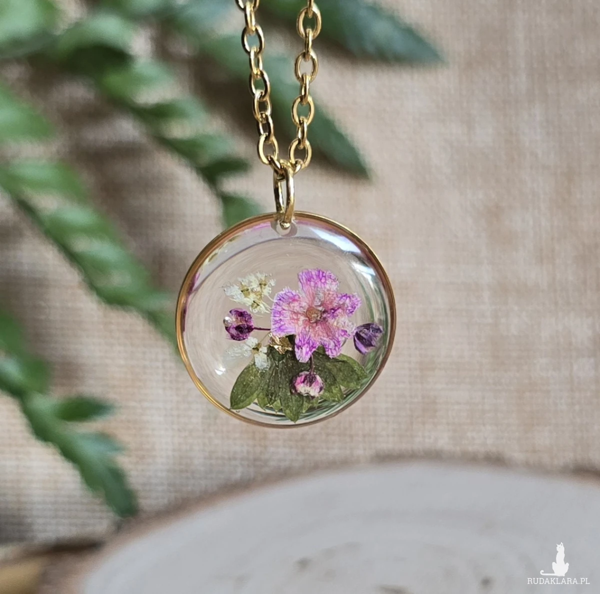 .Oferuję Państwu unikalną biżuterię. Zawieszka jest wykonana z suszonych kwiatów i żywicy epoksydowej. Biżuteria jest wspaniałym i oryginalnym prezentem na lata.
