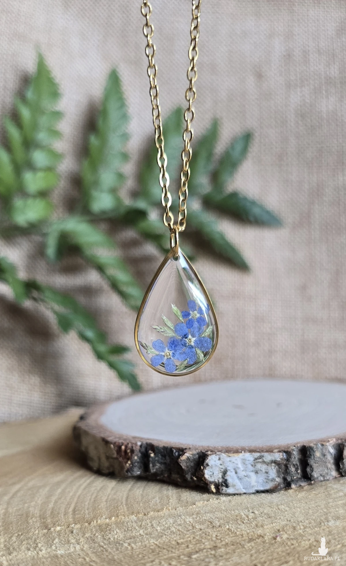 Złota zawieszka złoty wisiorek kwiat naszyjnik żywica z żywicy kwiaty łezka łza niezapominajka niezapominajki