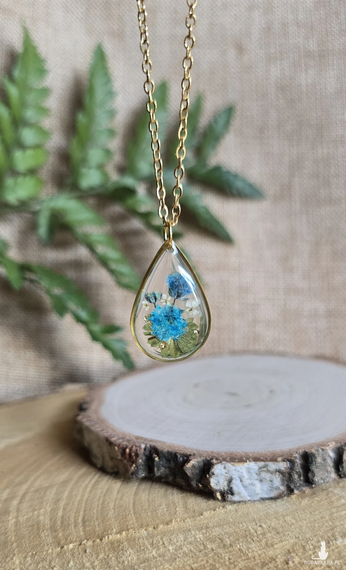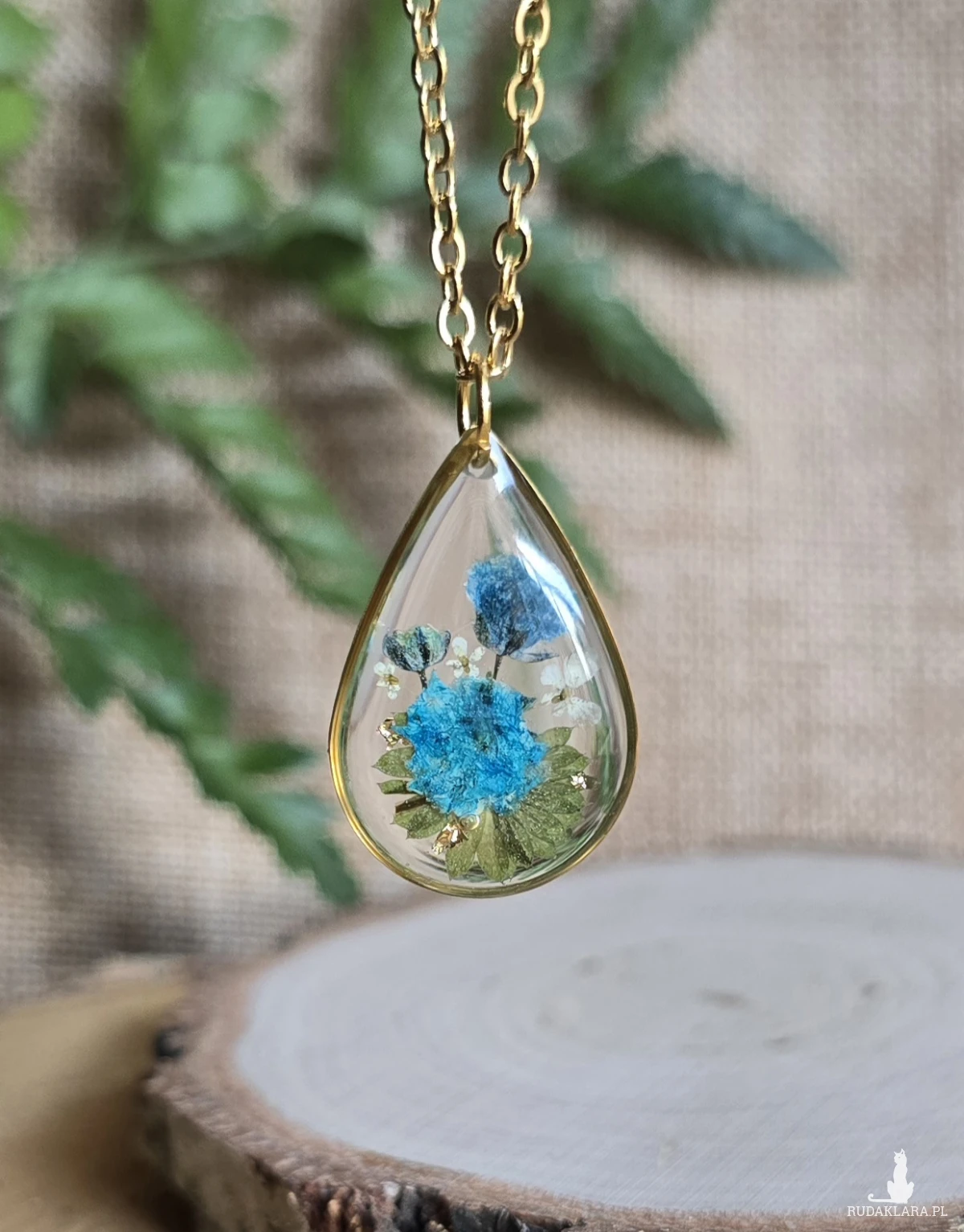 Oferuję Państwu unikalną biżuterię. Zawieszka jest wykonana z suszonych kwiatów i żywicy epoksydowej. Biżuteria jest wspaniałym i oryginalnym prezentem na lata.
