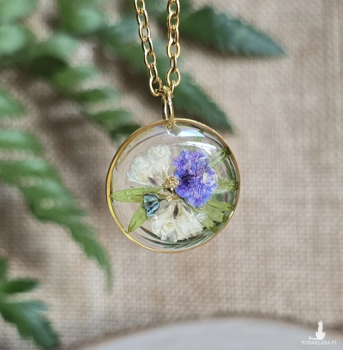 .Oferuję Państwu unikalną biżuterię. Zawieszka jest wykonana z suszonych kwiatów i żywicy epoksydowej. Biżuteria jest wspaniałym i oryginalnym prezentem na lata.