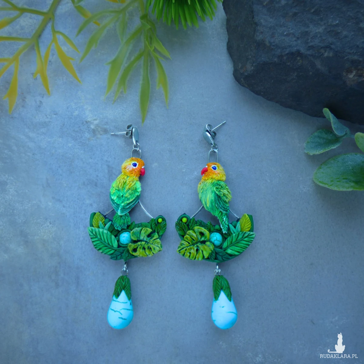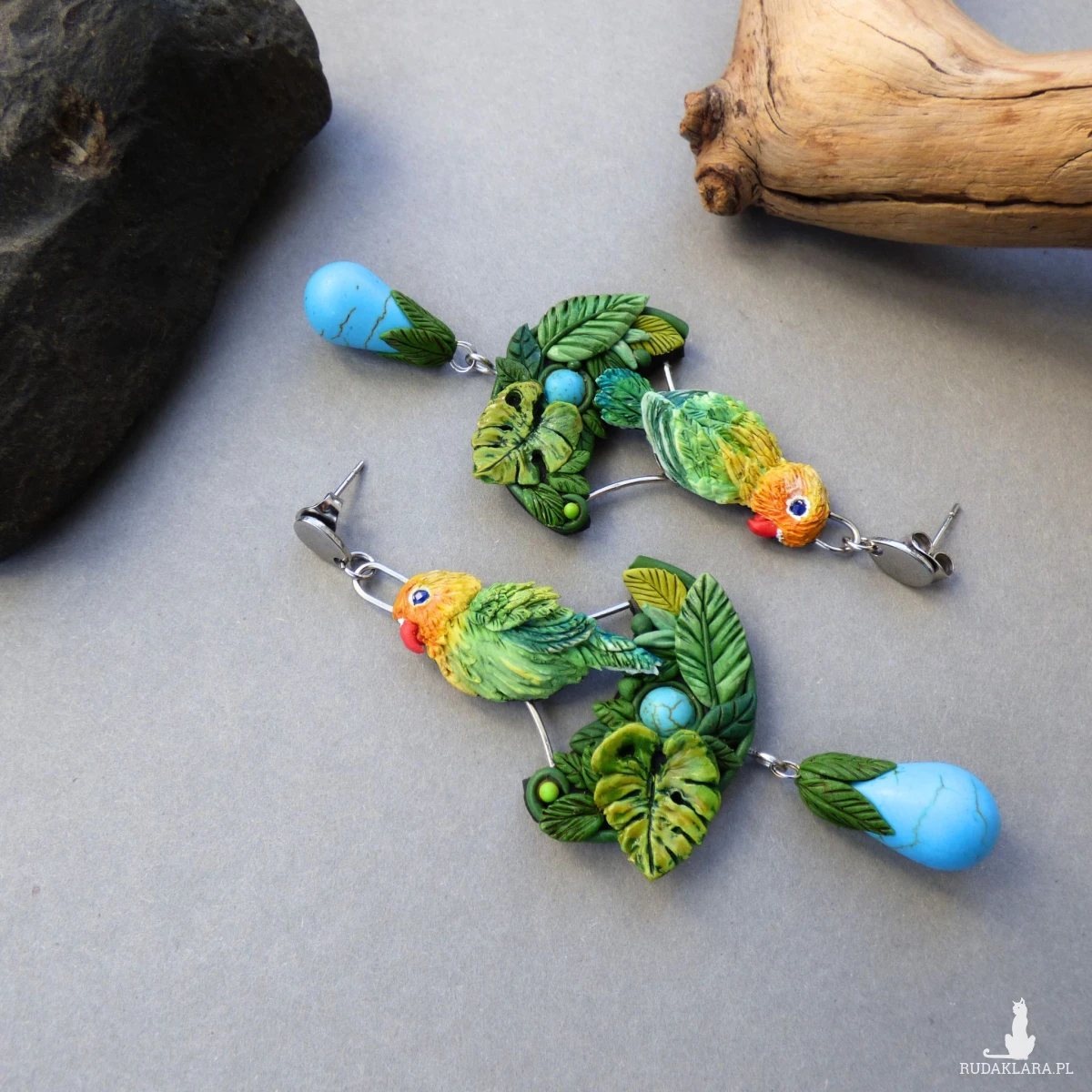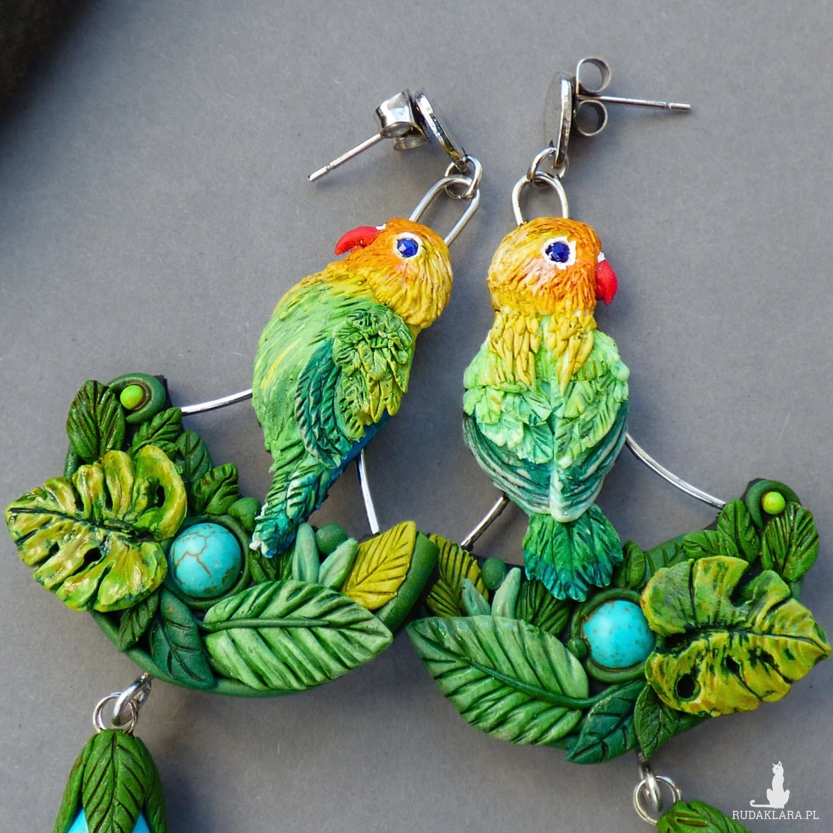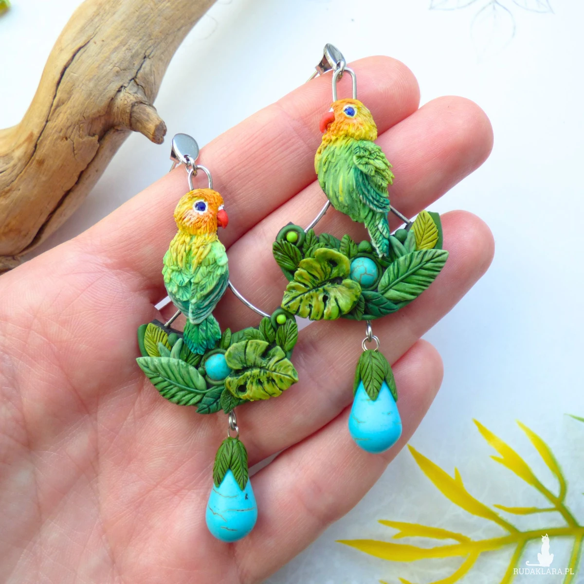 Kolczyki zaprojektowałam i wykonałam w pojedynczym egzemplarzu. Jest to w 100% rękodzieło, każdy element - ptaszek, piórko, listek, dziobek - jest modelowany i wykończony ręcznie bez form i odlewów (drobne różnice są naturalne i dodają uroku).