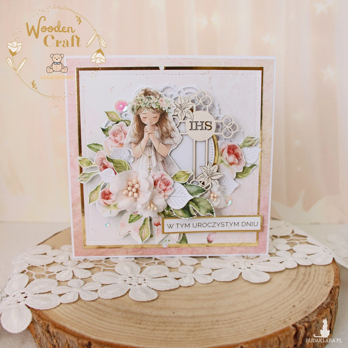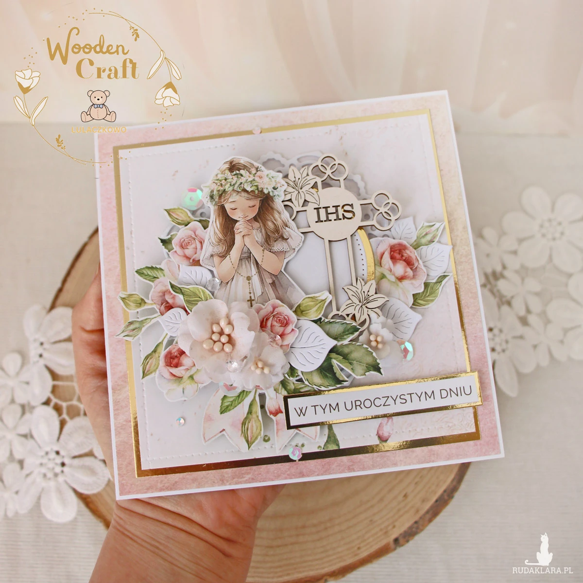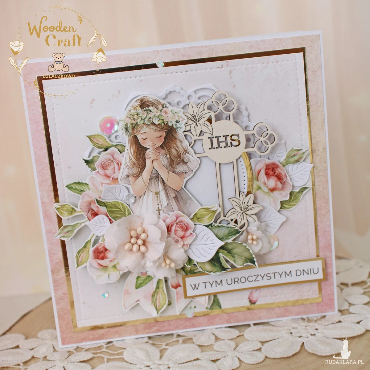 Piękna, elegancka kartka komunijna, pamiątka Pierwszej Komunii Świętej, wykonana ręcznie z najwyższą starannością, z cudownej kolekcji papierów "Rose Wine", utrzymana w pastelowych odcieniach malinowego różu, kremu i bieli, z dodatkiem złotych, błyszczących akcentów. Na środku kartki umieszona została grafika dziewczynki i tekturki krzyża z hostią świętą, otoczona kompozycją kwiatową, z ręcznie wykonanymi, materiałowymi kwiatami, oraz napisem "W Tym Uroczystym Dniu"- do napisu mogę również dodać imię dziecka.