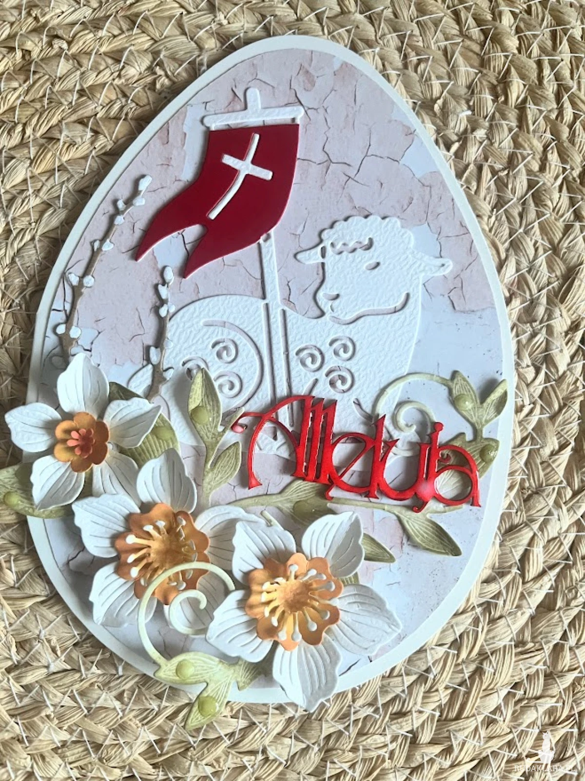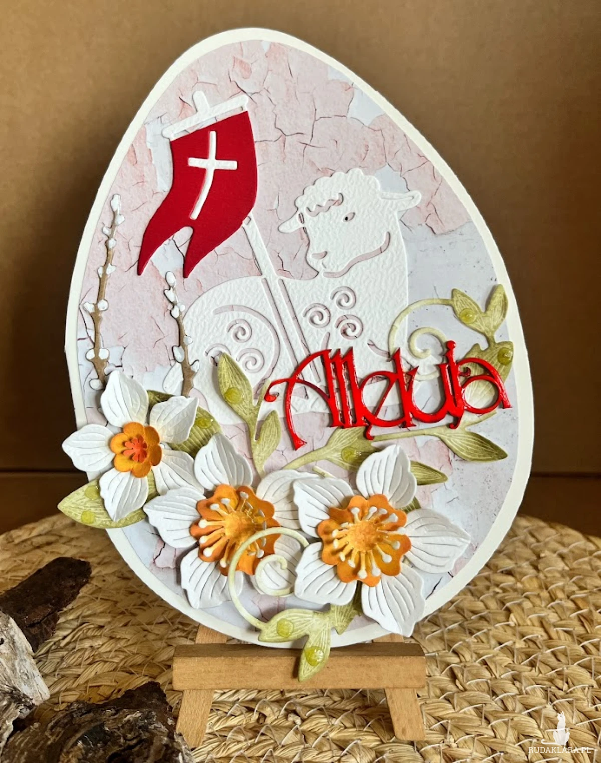 Wyjątkowa, oryginalna kartka w kształcie jajka, na życzenia z okazji Świąt Wielkanocnych. Wykonana z bezkwasowych papierach do scrapbookingu,Ozdobiona barankiem i kwiatami.Całość warstwowa dając efekt 3D. Kartka otwierana, wewnątrz miejsce na wpisanie życzeń.