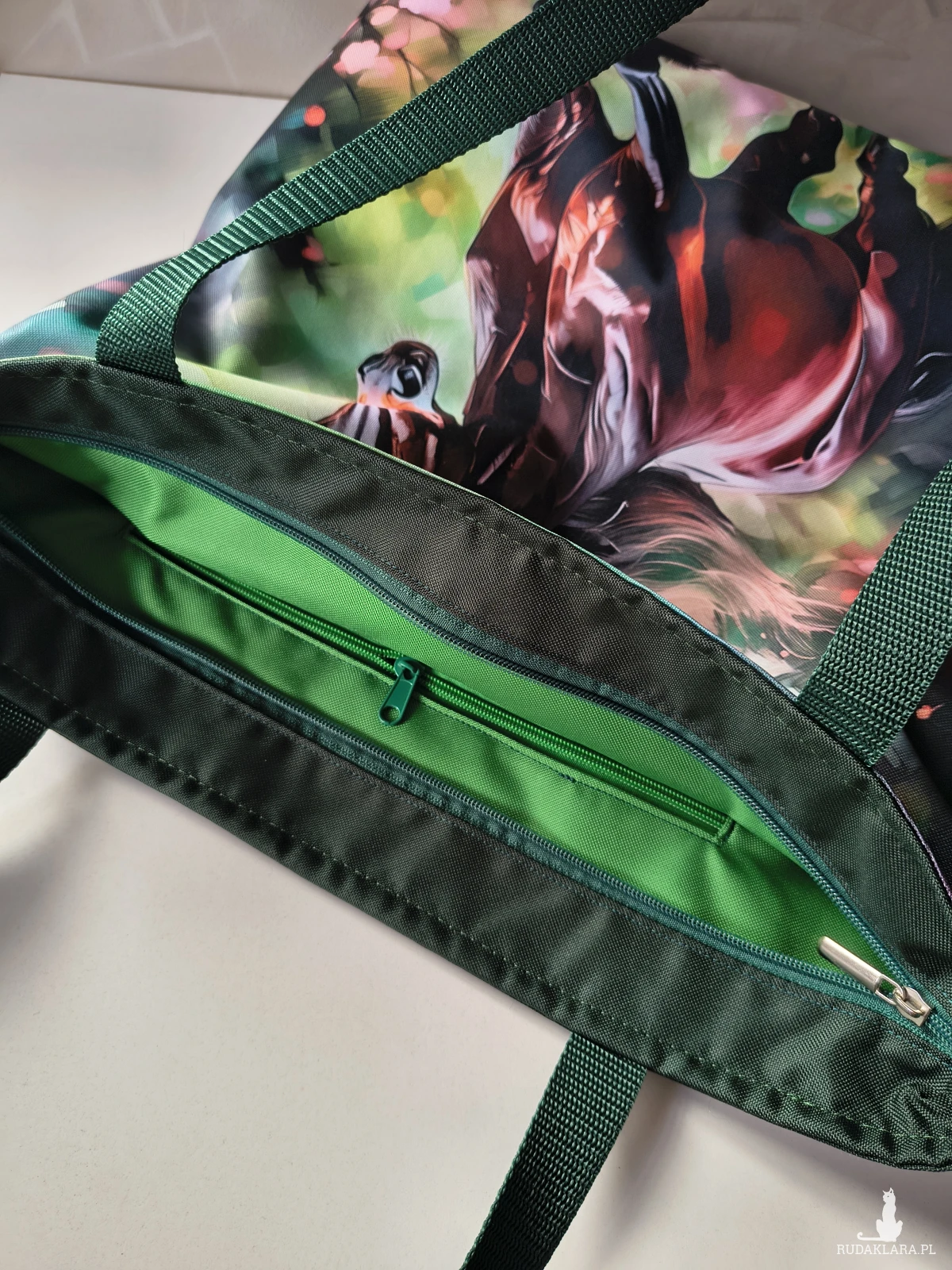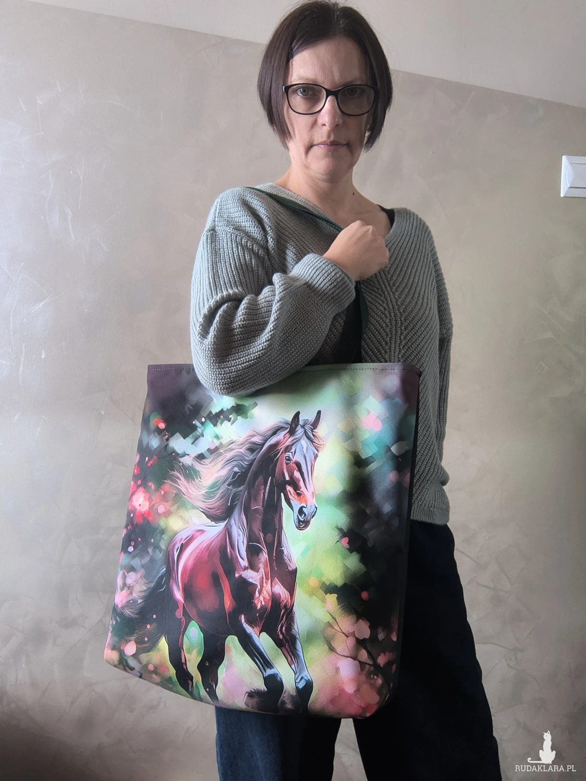To całkiem spora torba, a do tego wytrzymała Wykonana z materiału wodoodpornego, więc nie straszny jej deszcz czy zabrudzenia. Wewnątrz znajduje się wodoodporna podszewka z kieszonką na zamek. Zapinana na zamek. Na przedniej ścianie panel z pięknym koniem. Tył torby butelkowa zieleń..
