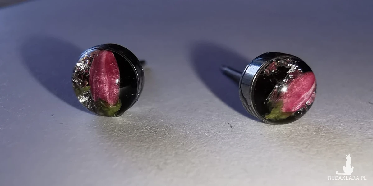 Wyjątkowe, błyszczące się kolczyki z zasuszonymi kwiatkami.