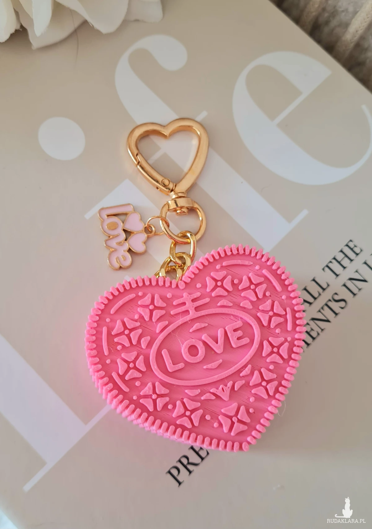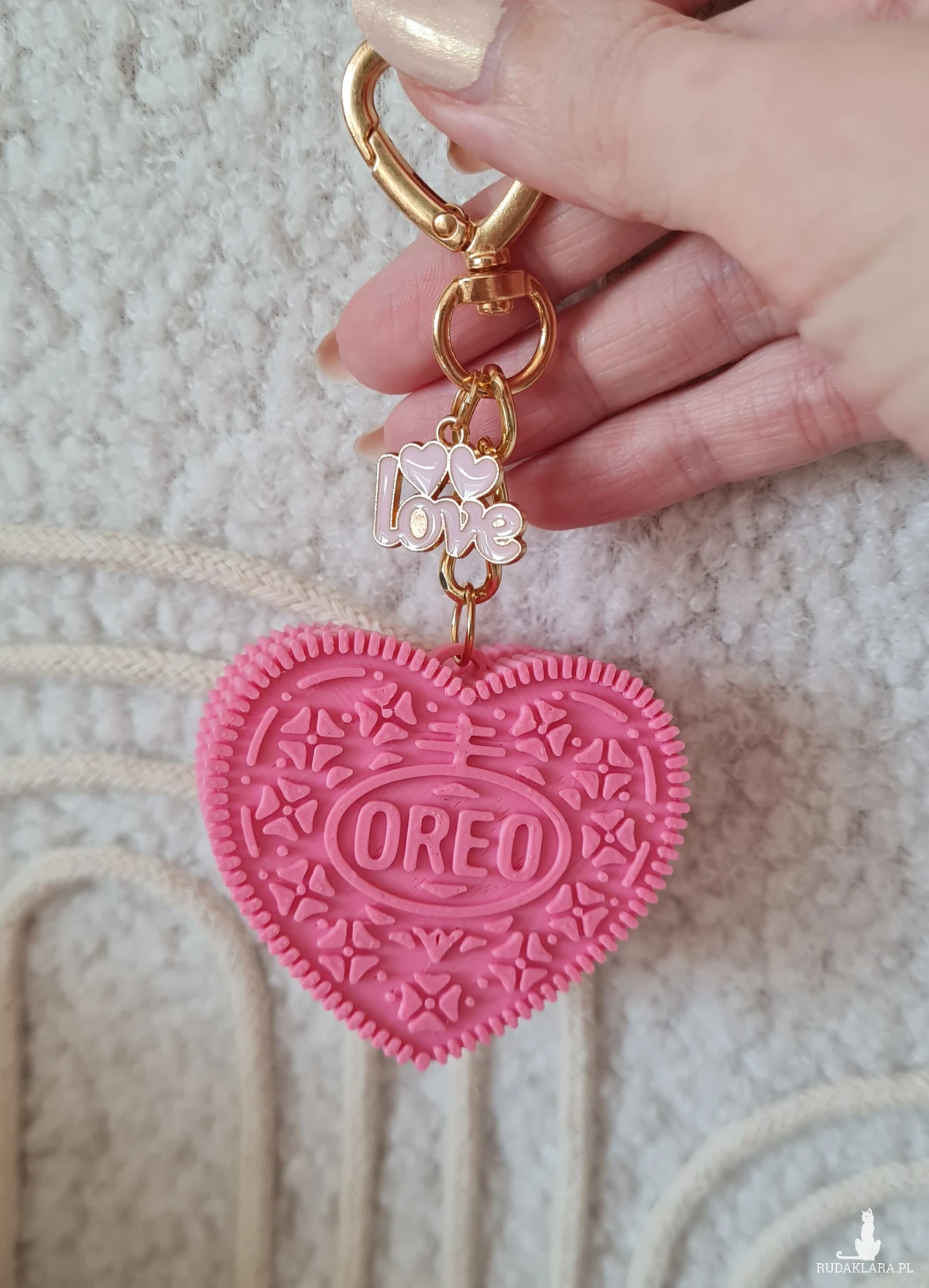 Uroczy breloczek do kluczy lub torebki w kształcie różowego serca z jednej strony z napisem "Love" z drugiej "Oreo" wzorowany na kultowym ciasteczku. Ciasteczko wykonane jest drukiem 3d z wysokiej jakosci biodegradowalnego polilaktydu (PLA), produkowanego z odnawialnych surowców, takich jak trzcina cukrowa czy mączka kukurydziana. Idealny drobiazg który doda odrobiny słodyczy codziennym przedmiotom lub stanie się symbolicznym prezentem prosto z serca ♡