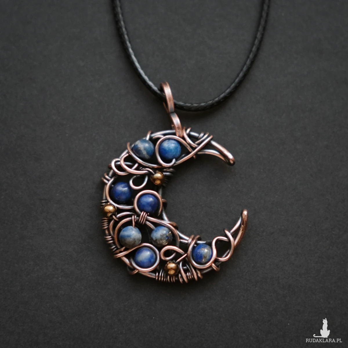 Miedziany wisiorek - księżyc z kamieniami lapis lazuli. Piękne fantazyjne sploty dodają mu baśniowego charakteru.