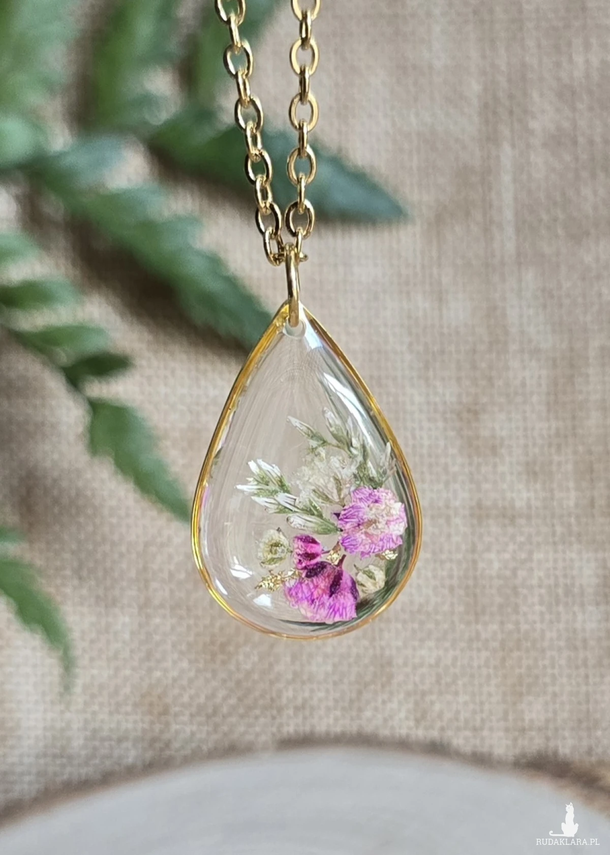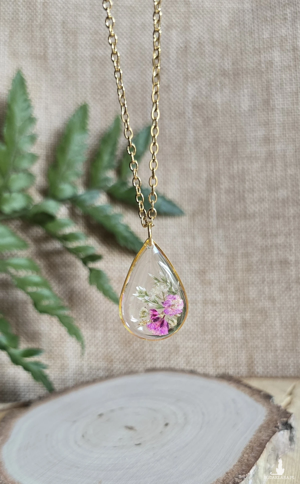 Oferuję Państwu unikalną biżuterię. Zawieszka jest wykonana z suszonych kwiatów i żywicy epoksydowej. Biżuteria jest wspaniałym i oryginalnym prezentem na lata.