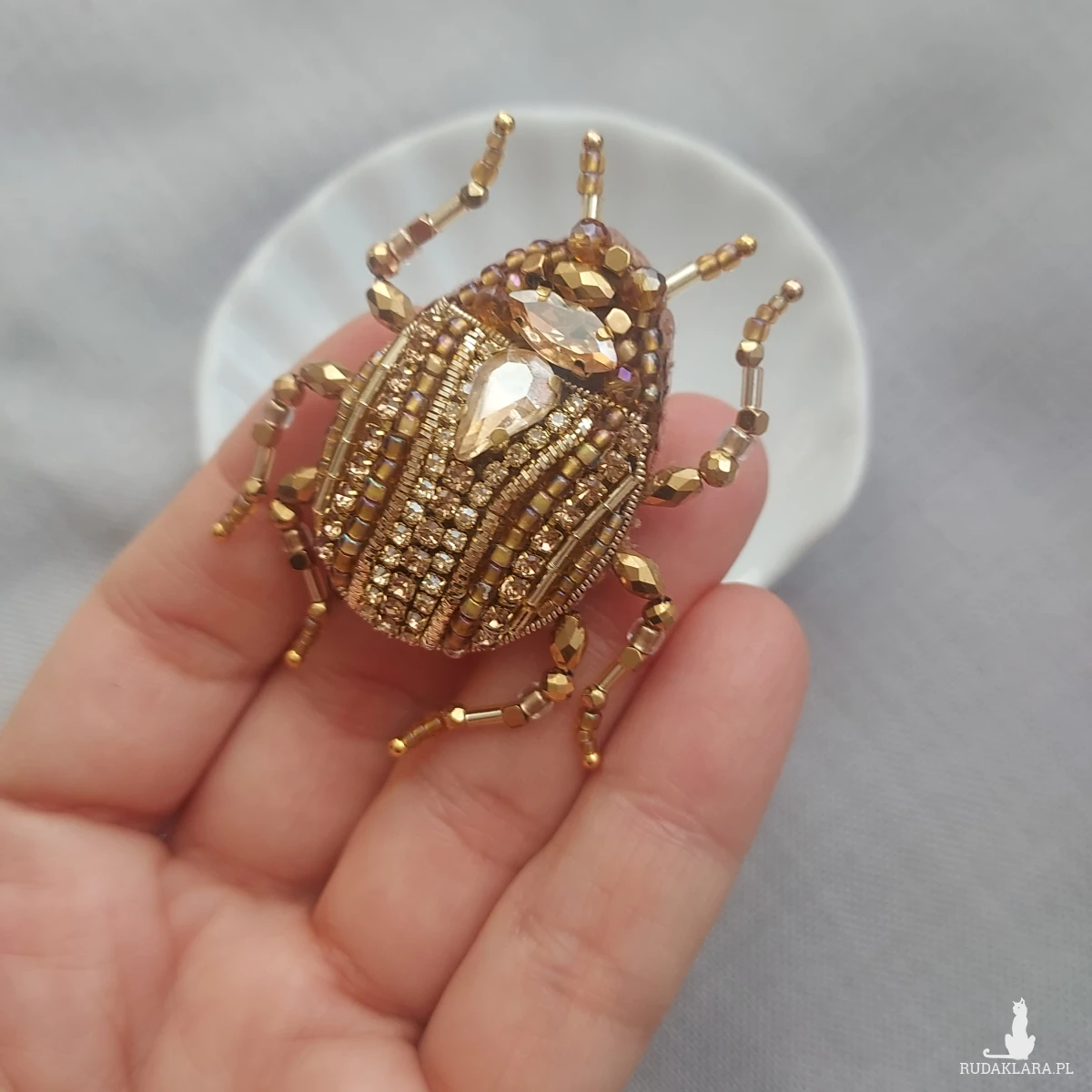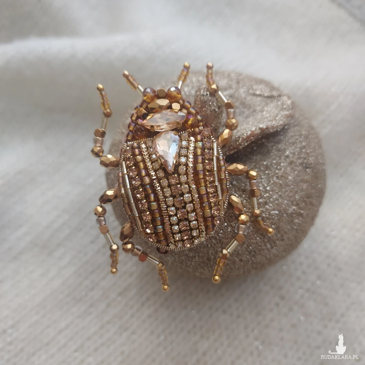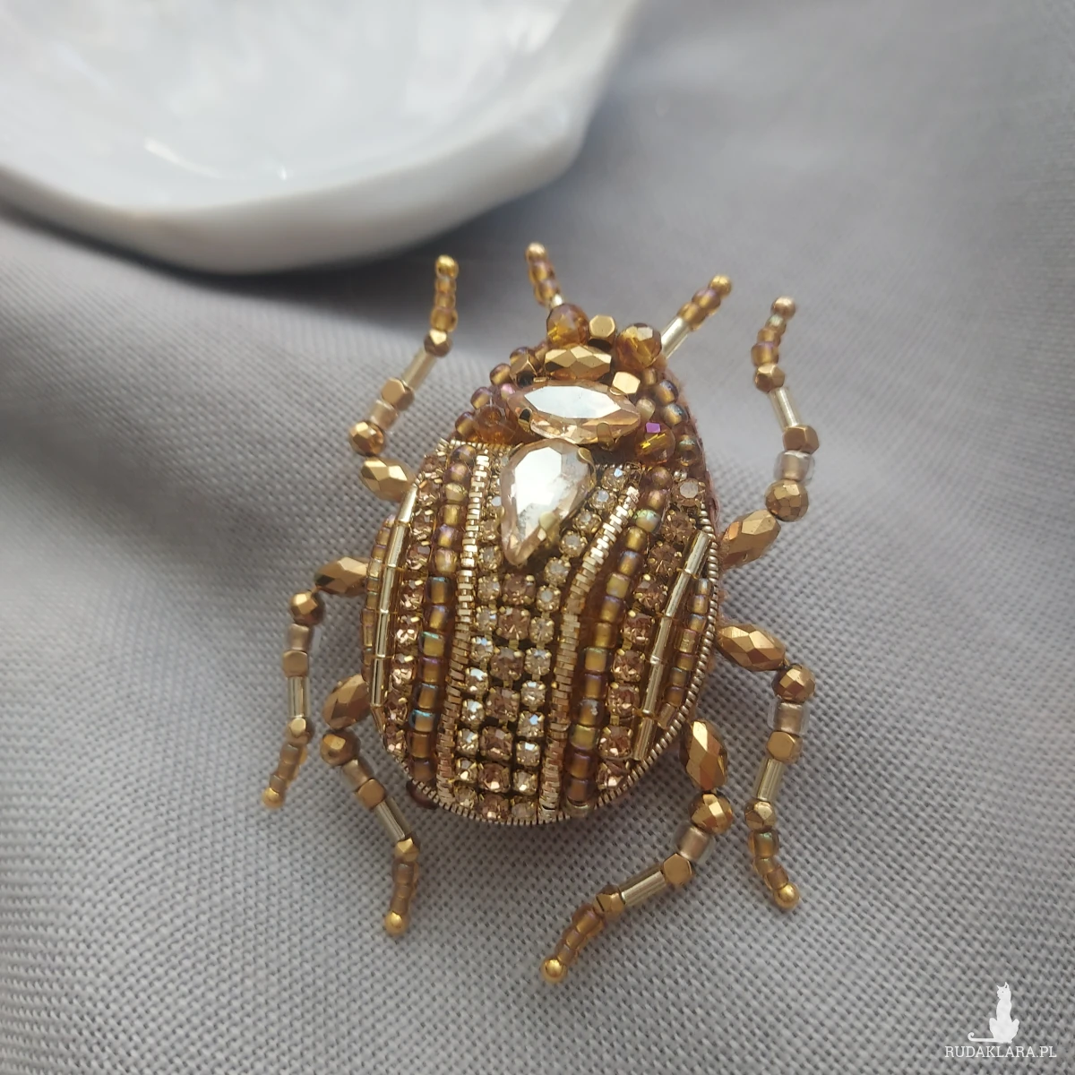 Wyjątkowa, jedyna w swoim rodzaju broszka ŻUCZEK w kolorze złotym przyciągnie uwagę niespotykanym blaskiem koralików oraz kryształków pięknie mieniących się w promieniach wiosenno-letniego słońca.