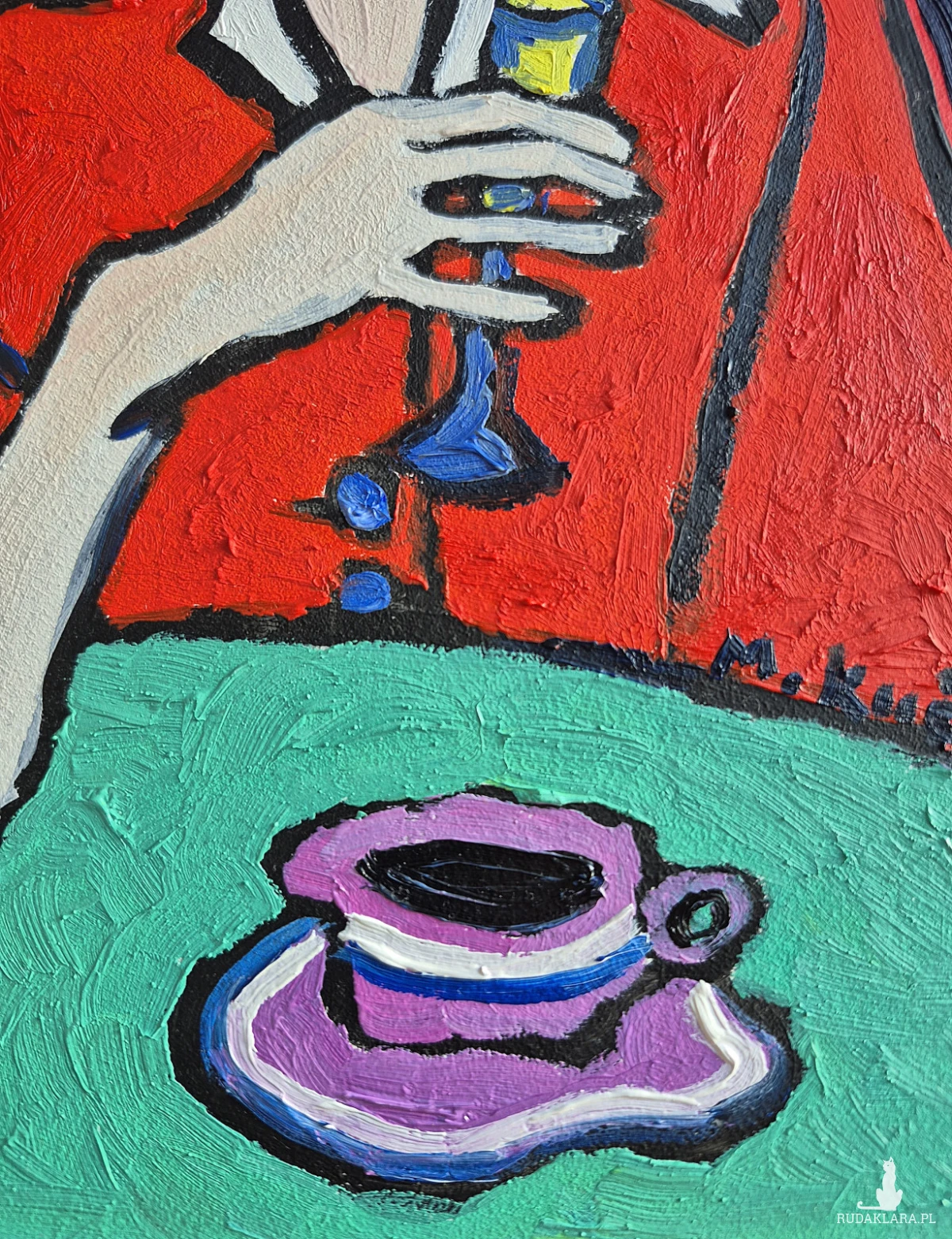 W dłoni trzyma smukły kieliszek z niebieską nóżką, jakby celebrując samotny toast. Przed nią na zielonym stole stoi filiżanka w odcieniach różu i fioletu – kawa już dawno wystygła. To scena zatrzymana między jednym łykiem a kolejnym zaciągnięciem.