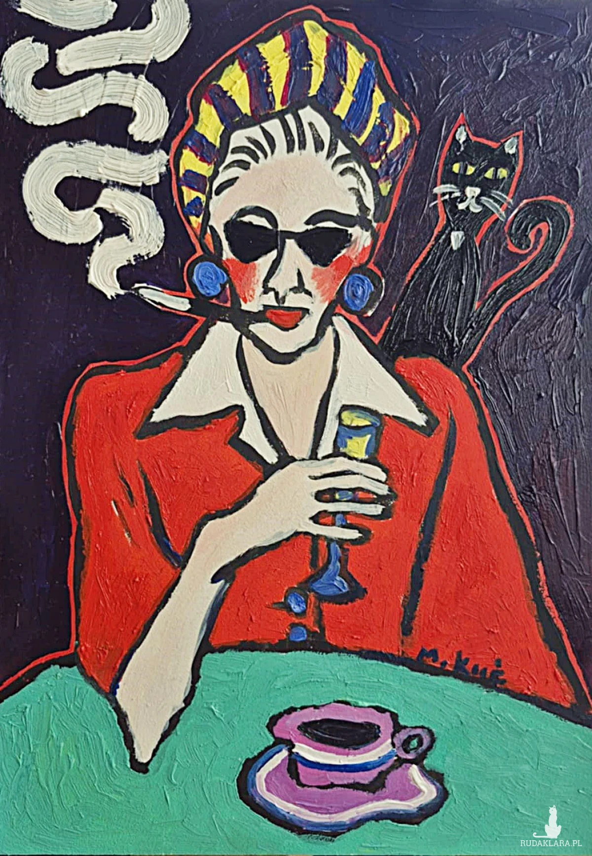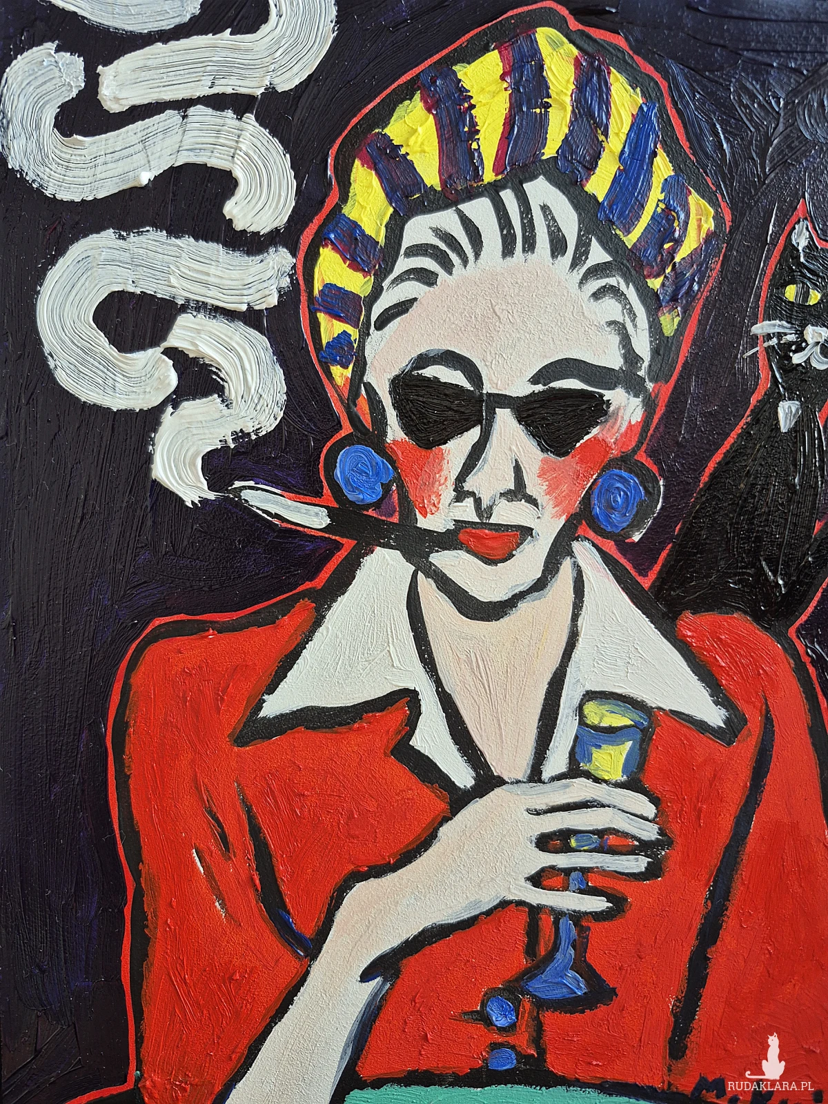 Na obrazie siedzi kobieta jak wyjęta z teatralnej sceny nocnego kabaretu. Twarz ma bladą, niemal porcelanową, przeciętą ostrymi liniami czerni. Czarne okulary zasłaniają jej spojrzenie, jakby świat był dla niej zbyt jasny albo zbyt prawdziwy. Policzki płoną czerwienią – nie rumieńcem niewinności, lecz śladem namiętności, zmęczenia albo dymu unoszącego się ciężko w powietrzu.