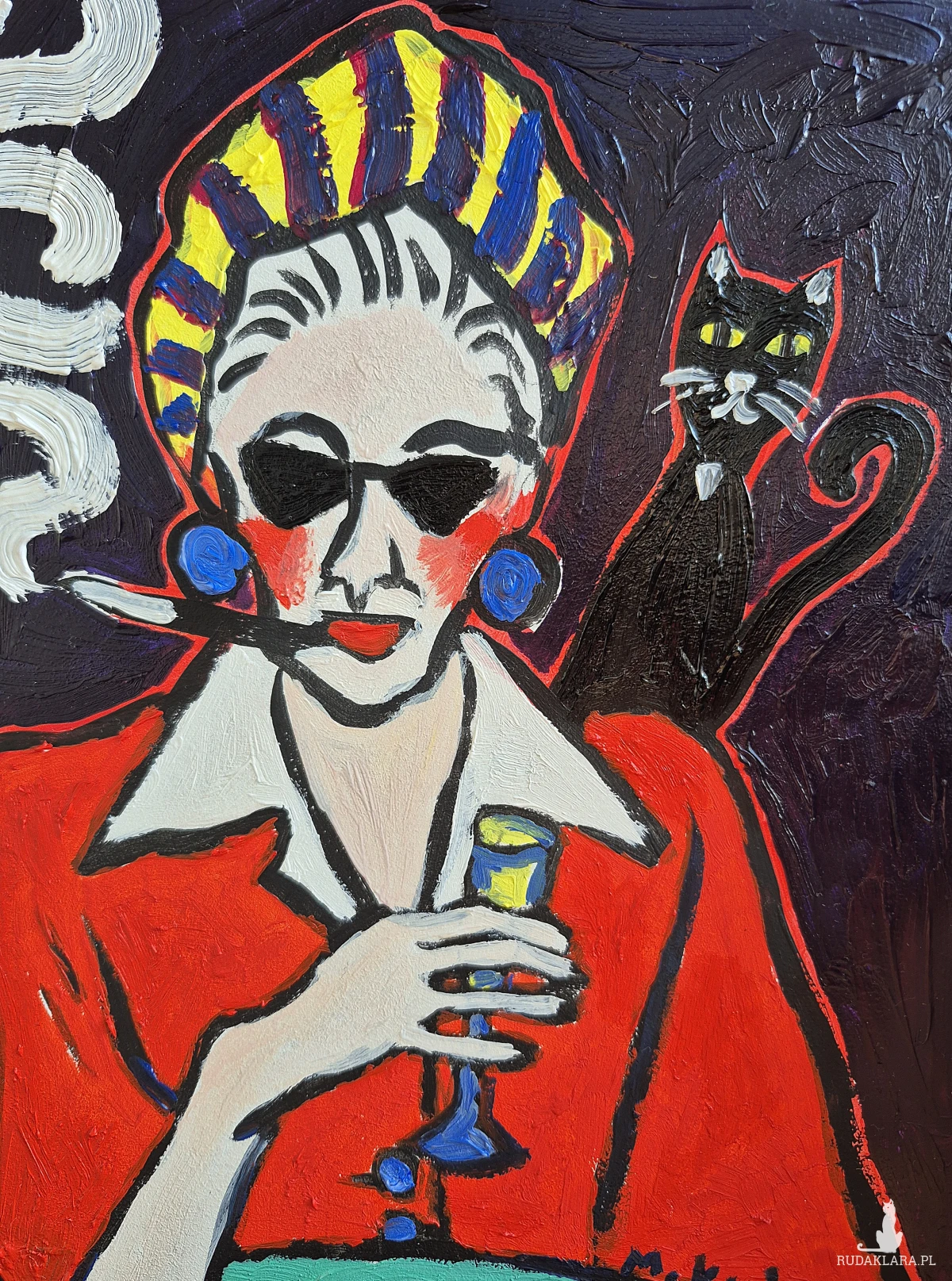 Za jej plecami czarny kot o żółtych oczach wygina grzbiet i ogon w elegancki łuk. Jest jak cień jej myśli – czujny, ironiczny, może trochę złośliwy. Patrzy na widza z tajemnicą, której kobieta nie zdradza.