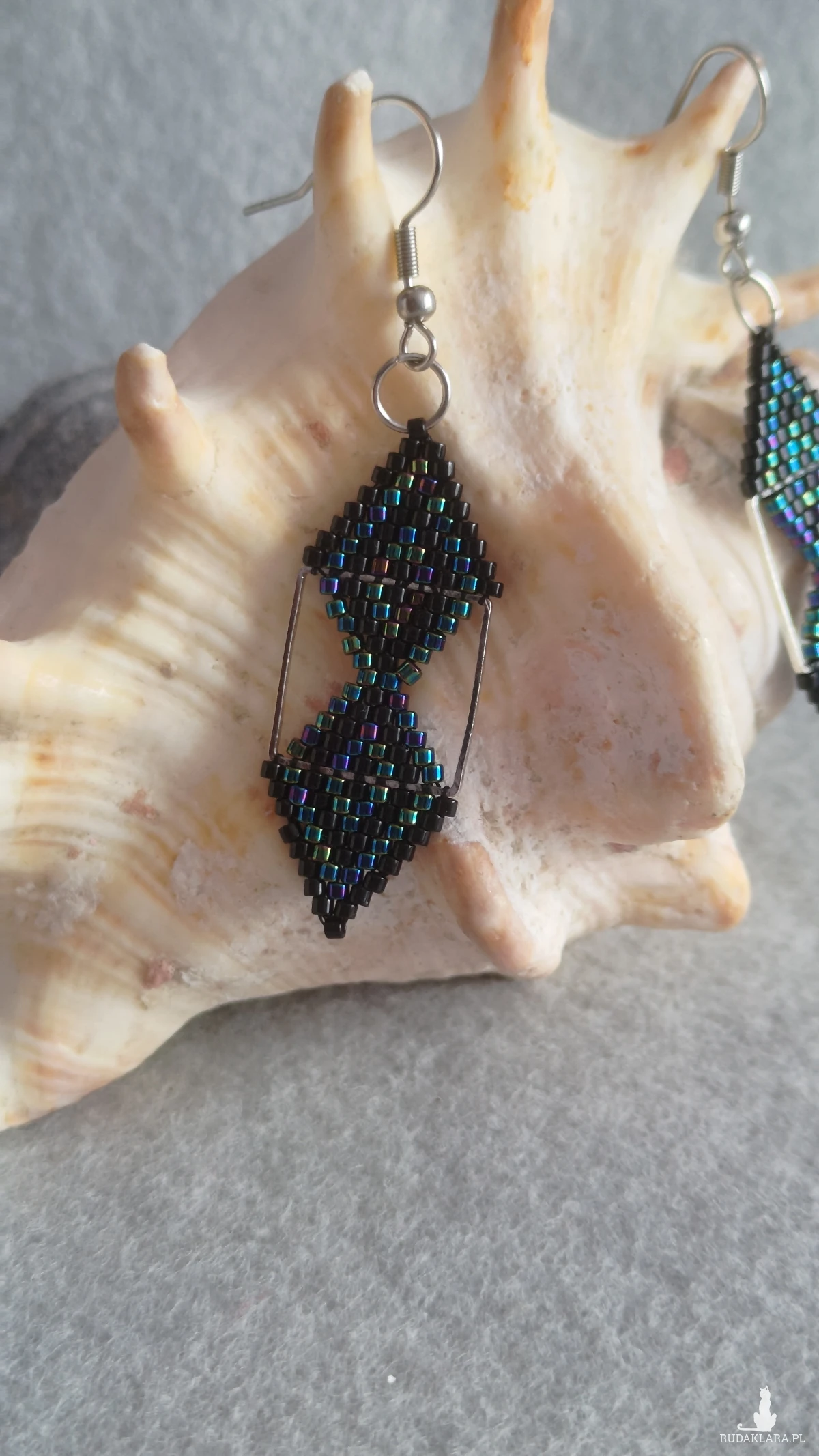 Kolczyki z czarnych i tęczowych koralików myuki, zrobine na kwadratowej, metalowej bazie. Kolczyki są stylowe i nietuzinkowe, pięknie błyszczą w słońcu, dla osób, które lubią zaskakiwać. Kolczyki zawieszone są na biglach ze stali chirurgicznej.