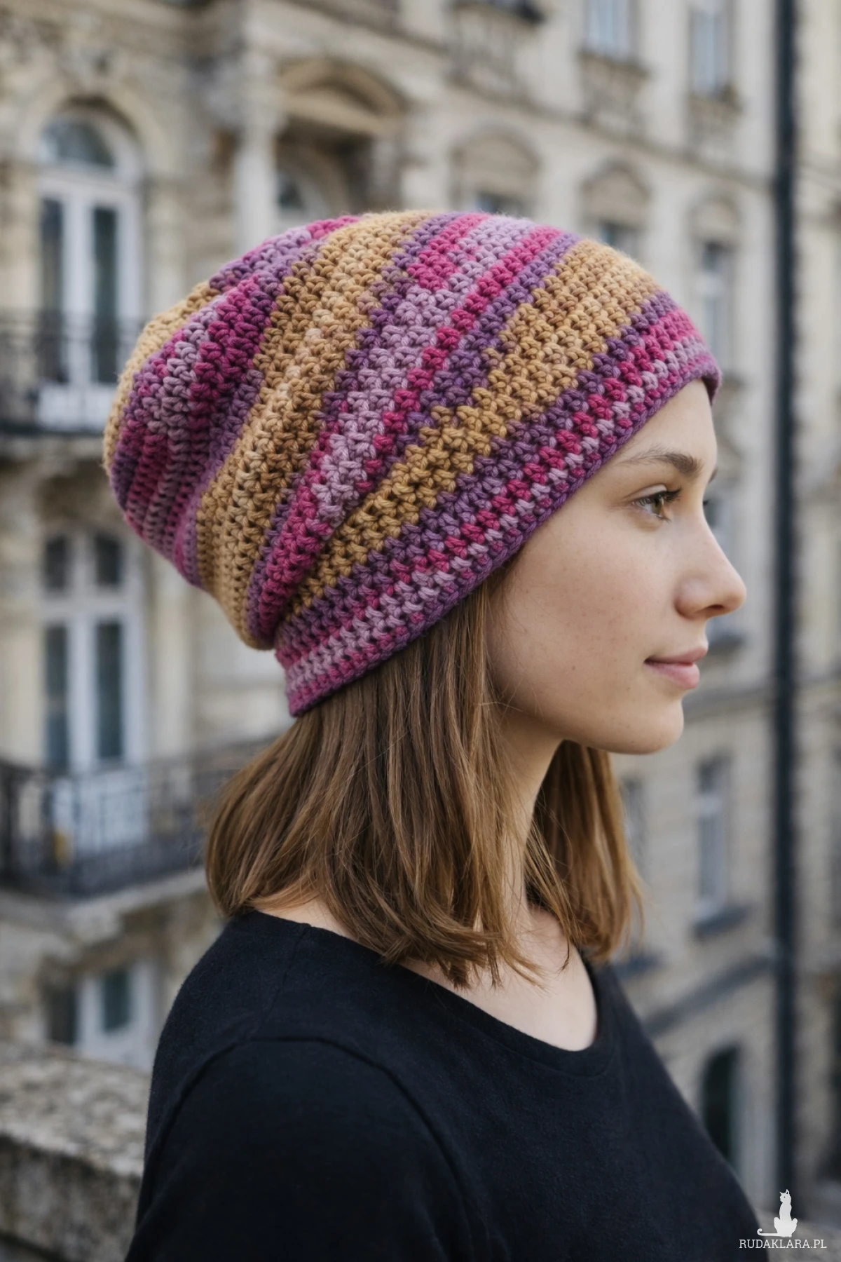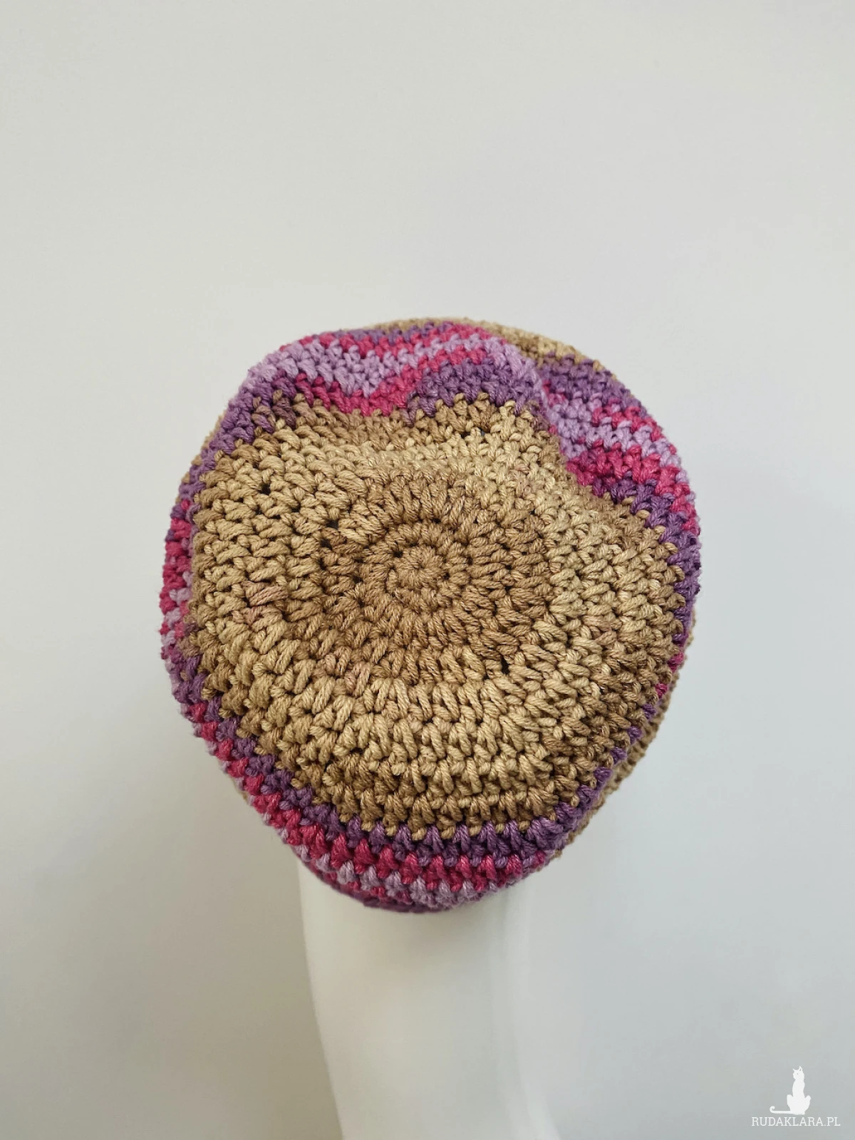 Czapkę wykonałam z wysokiej jakości włóczki bawełniano-akrylowej, która zapewnia wygodę noszenia przez cały dzień.