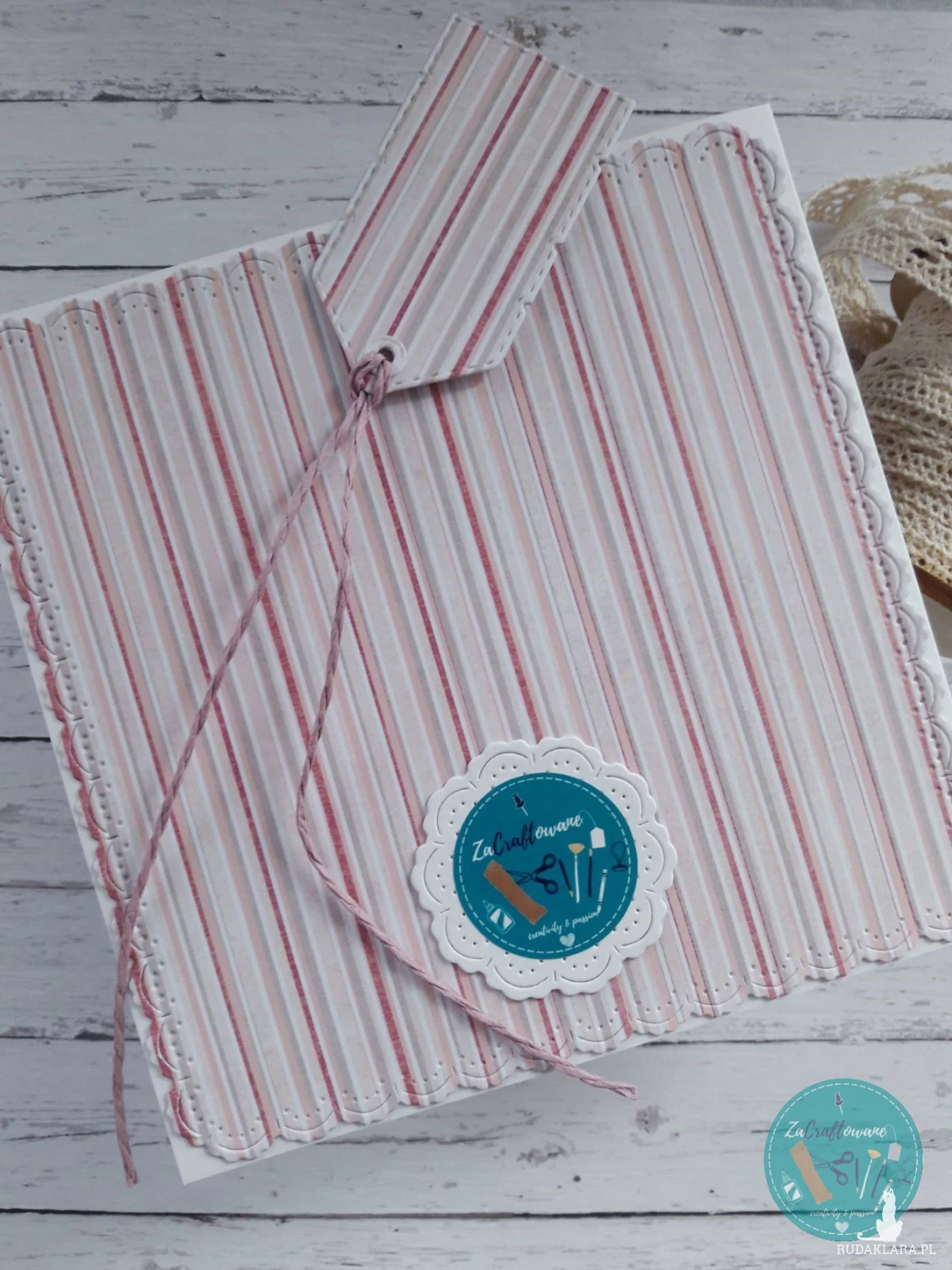 Do kartki dołączam GRATIS w postaci widocznej na zdjęciu etykietki, za pomocą której można podpisać upominek dla przyszłej Panny Młodej i przyczepić ją do wstążki, którą obwiązany jest prezent, za pomocą sznureczka, który również znajduje się w zestawie.