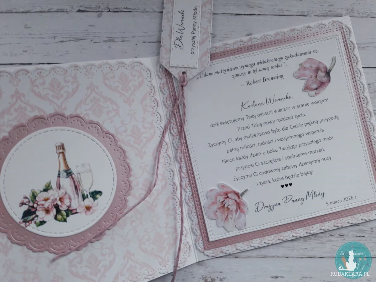 Wręczając życzenia z okazji wieczoru panieńskiego, wypisane na tej unikatowej, ręcznie robionej kartce z dziewczynami, które pędzą świętować z przyszłą Panną Młodą ostatni wieczór w stanie wolnym, masz pewność, że nie zginą w tłumie pozostałych i sprawią radość obdarowanej nią osobie.