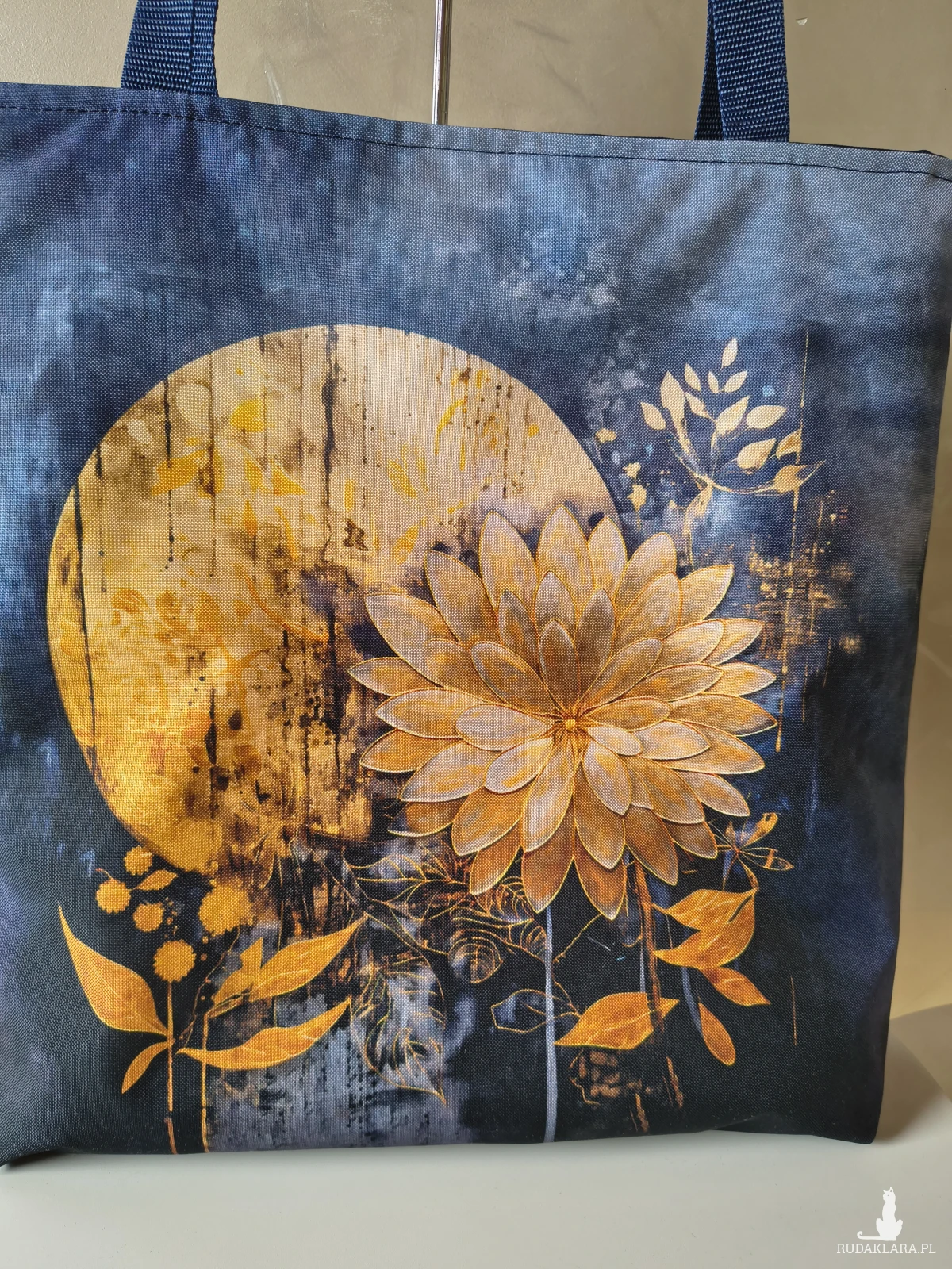 To bardzo pojemna torba, a do tego wytrzymała Wykonana z materiału wodoodpornego, więc nie straszny jej deszcz czy zabrudzenia. Wewnątrz znajduje się wodoodporna podszewka z kieszonką na zamek. Torba zapinana na zamek. Na przedniej ścianie panel z kwiatami na tle księżyca. Tył torby granatowy.