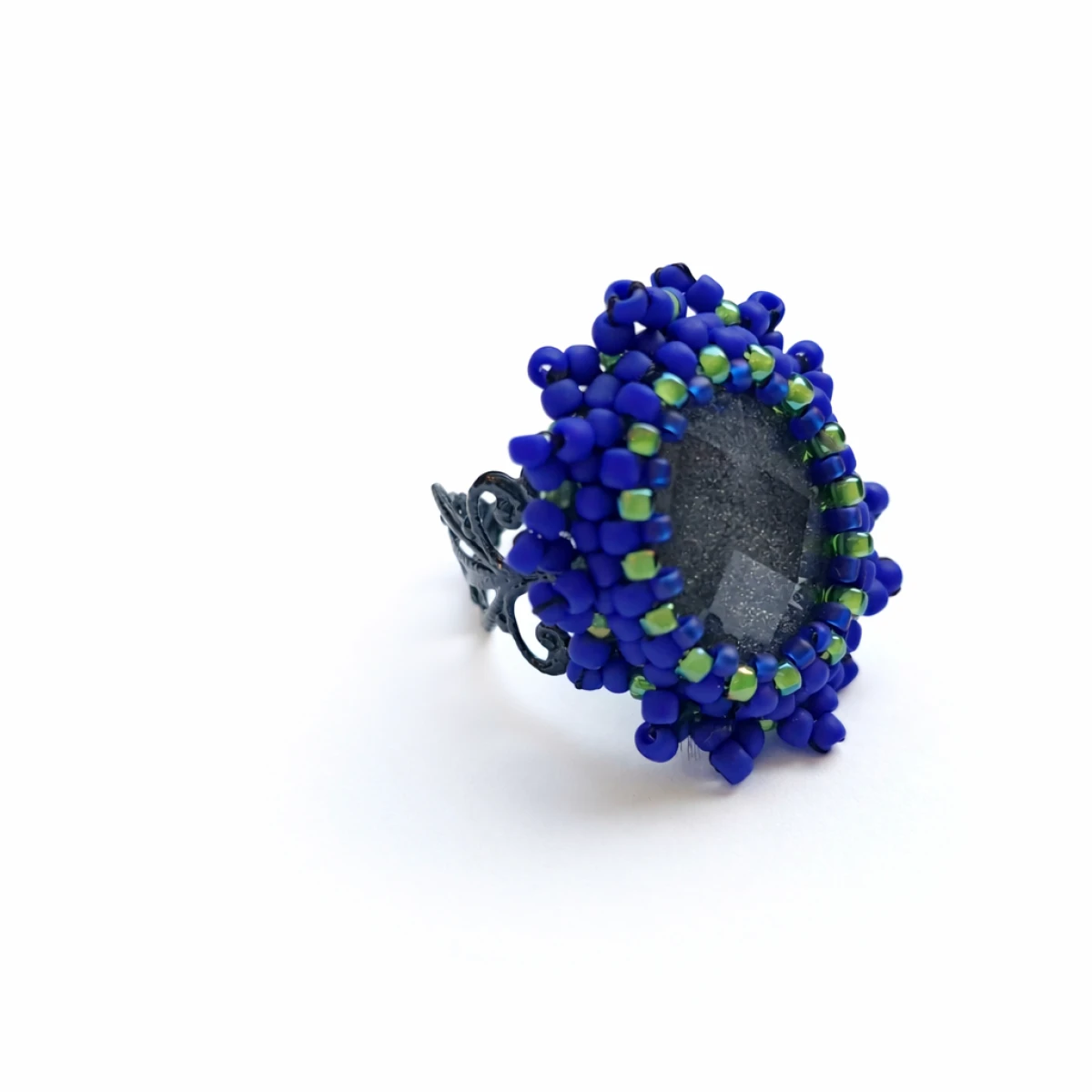 Ręcznie wykonany pierścionek Aurora Noctis z japońskich koralików w odcieniach fioletowego matu i błyszczącej zieleni.