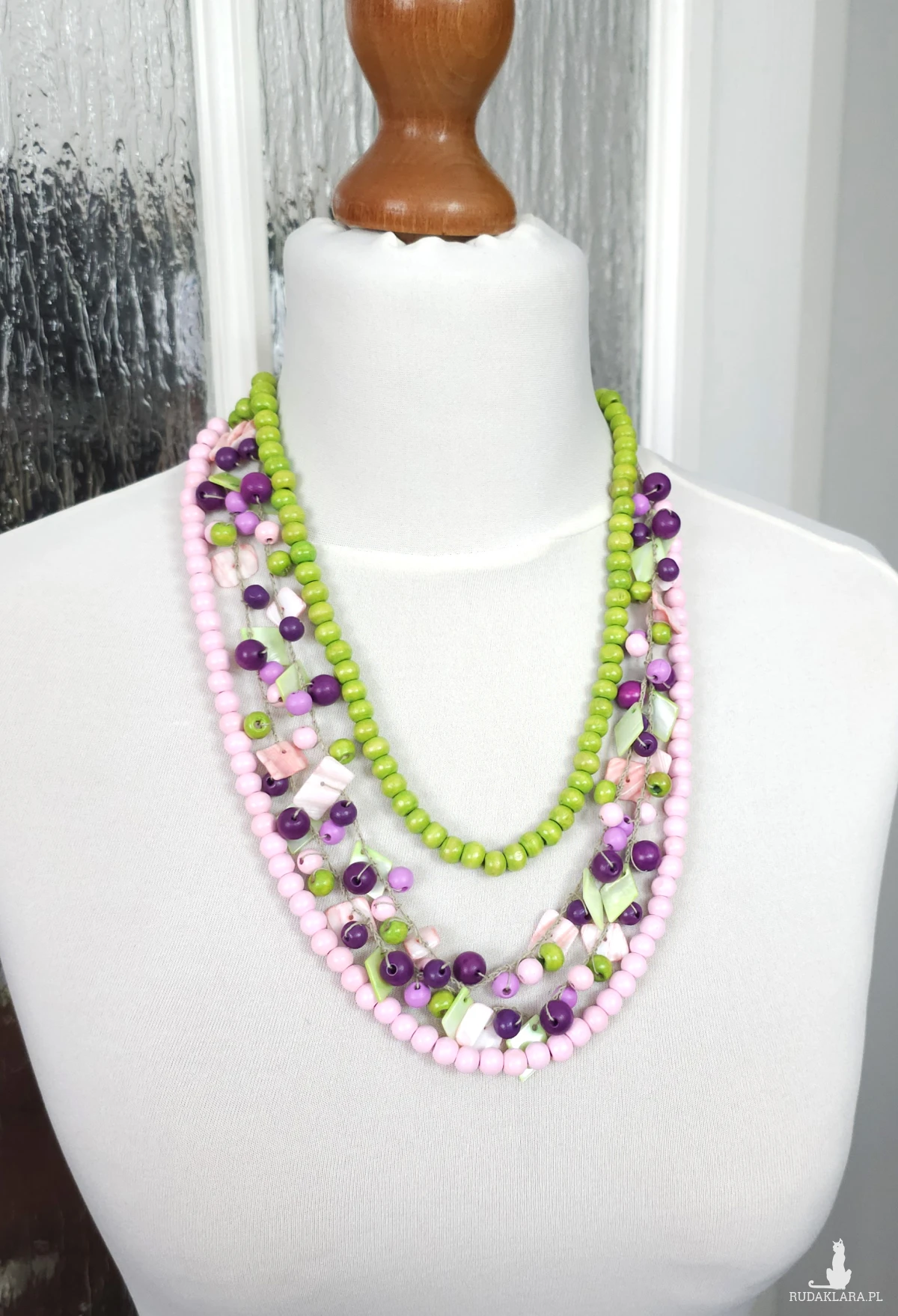 Wielowarstwowy naszyjnik wykonany z naturalnych materiałów: barwionego drewna, muszli oraz masy perłowej.