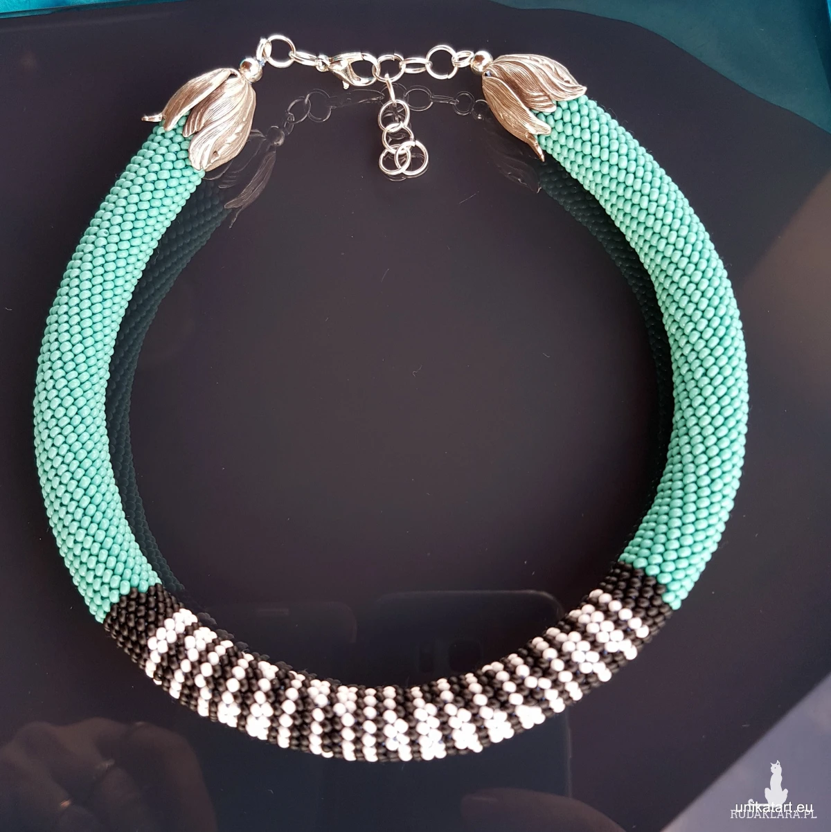 Dodaj koloru i wyrazistości swojej stylizacji dzięki unikatowemu naszyjnikowi wykonanemu techniką sznura szydełkowo-koralikowego. To idealne połączenie nowoczesnego designu z precyzyjnym rękodziełem. Centralnym punktem naszyjnika jest kontrastowy, czarno-biały motyw pasów przypominający zebrę, który płynnie przechodzi w soczysty, turkusowy błękit. Całość została wykończona eleganckimi elementami w kolorze srebra – ozdobne końcówki w kształcie tulipanów dodają mu romantycznego, a zarazem luksusowego charakteru. Wykonany z tysięcy drobnych koralików szklanych, co zapewnia piękny połysk i trwałość. Naszyjnik jest lekki, elastyczny i przyjemny dla skóry. Wyposażony w solidne zapięcie typu karabińczyk z łańcuszkiem przedłużającym, co pozwala na idealne dopasowanie długości. Doskonale sprawdzi się zarówno do białej koszuli, jak i letniej sukienki czy casualowego t-shirtu.