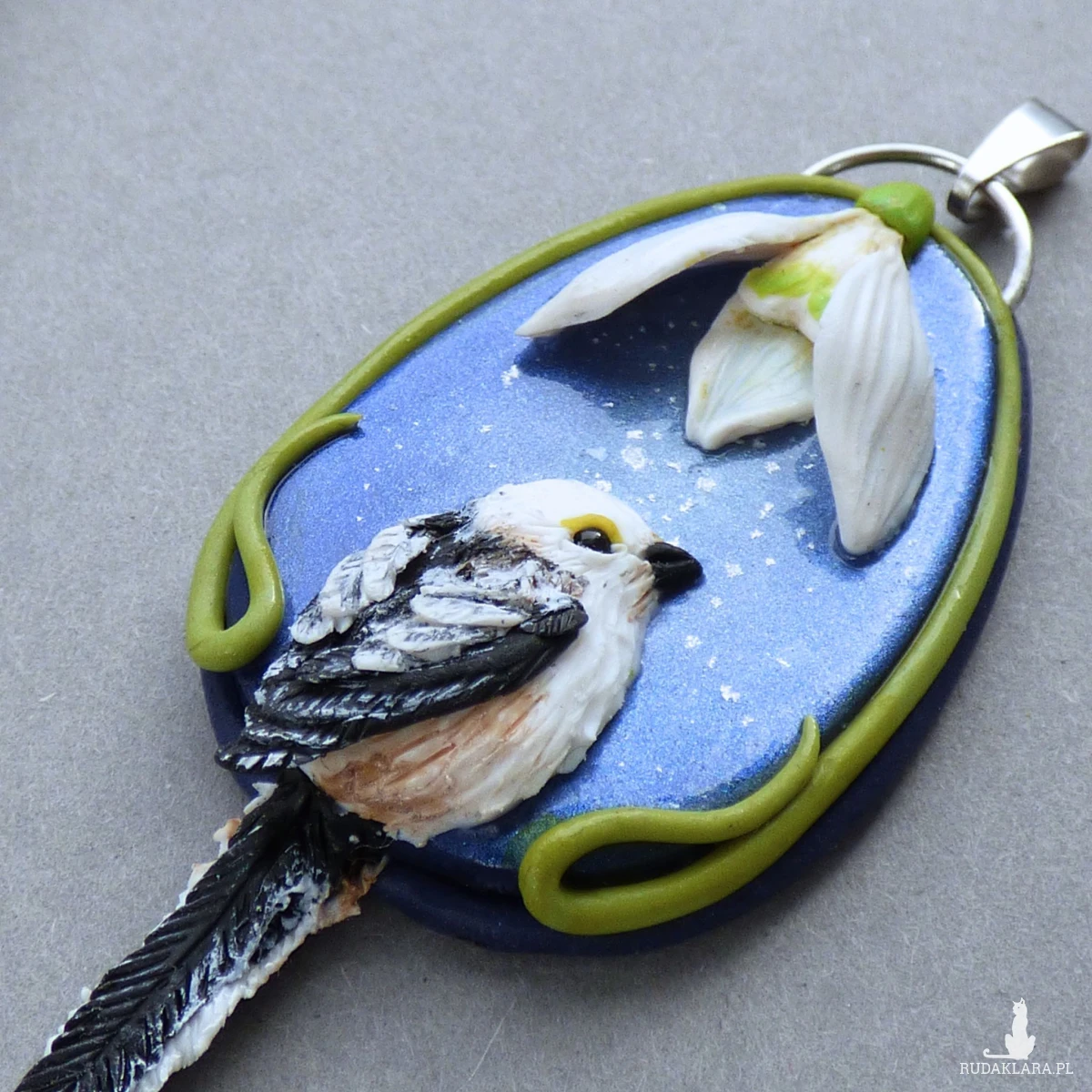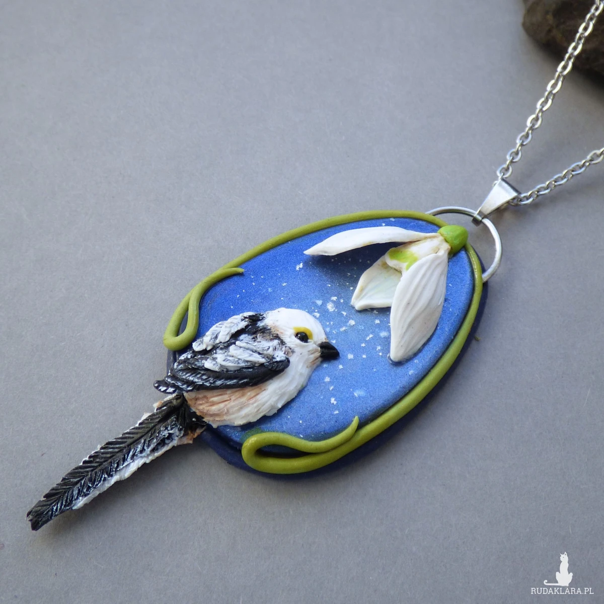 Materiały: glinka polimerowa (modelina Fimo), metalowa baza (stal szlachetna), farby akrylowe, lakier fimo, czarny onyks kulka 2mm (oko ptaka), łańcuszek ze stali szlachetnej.