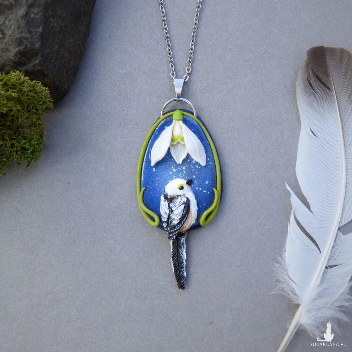 Unikatowy naszyjnik inspirowany końcówką zimy i pierwszymi oznakami wiosny. Na głębokim, granatowym tle znajduje się ręcznie wyrzeźbiony kwiat przebiśniegu, a poniżej – raniuszek (uroczy, puchaty ptaszek z długim ogonkiem). Tło zostało pokryte błyszczącym lakierem, dzięki czemu daje efekt lodowej tafli i pięknie odbija światło – jak zimny poranek, kiedy wiosna dopiero „puka” do drzwi.