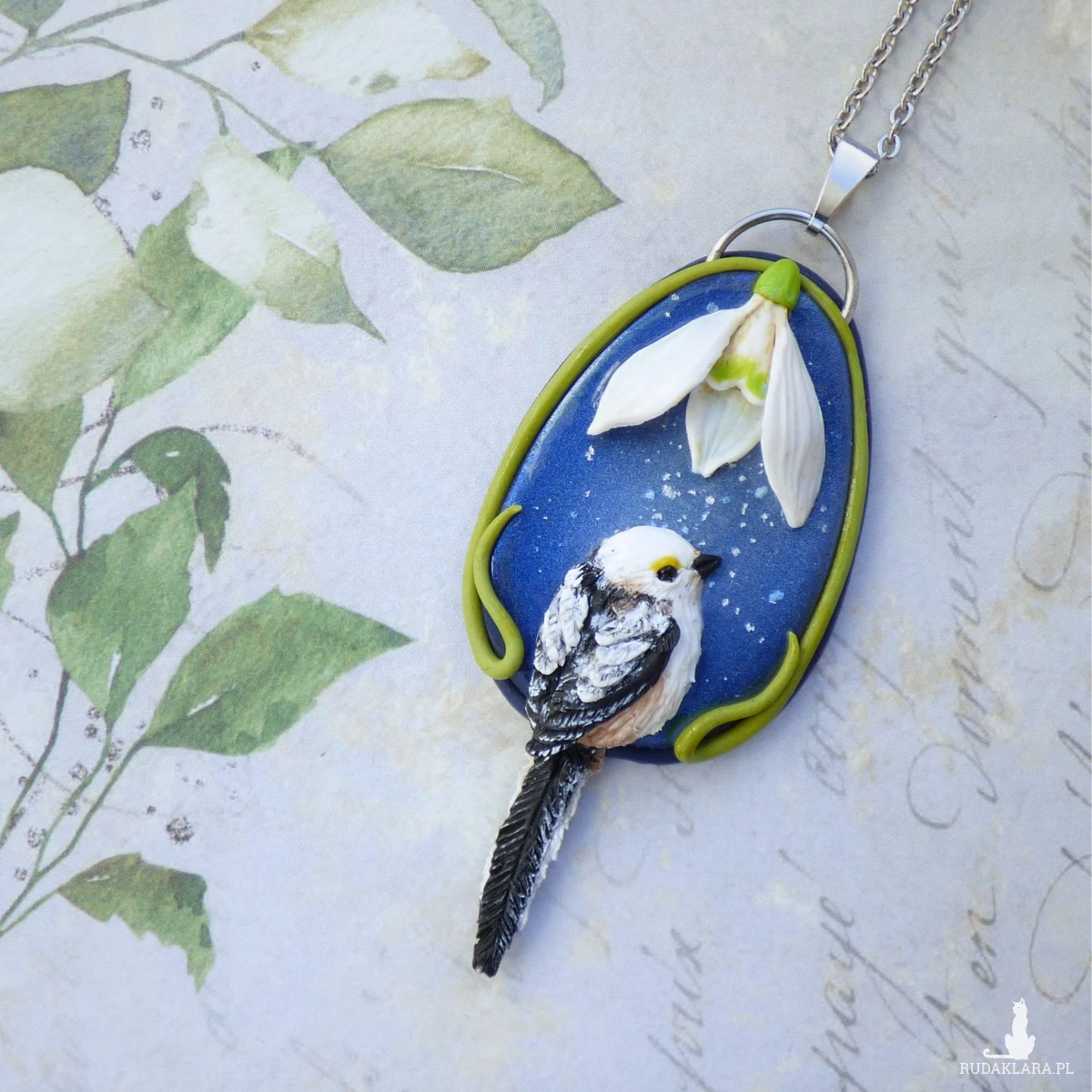 Całość oprawiona jest w zielone, roślinne linie - pędy oraz zawieszona na łańcuszku ze stali szlachetnej. Każdy detal powstaje w całości ręcznie (modelowanie, fakturowanie, malowanie i cieniowanie), dlatego to biżuteria dla osób, które kochają naturę i dopracowane miniatury.