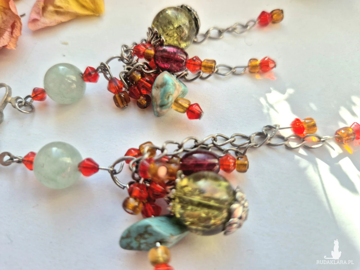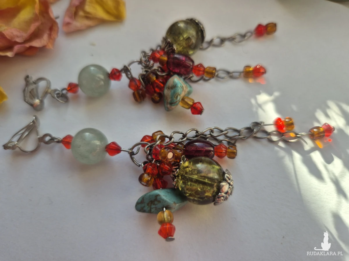 Klipsy : pasikonik nóżką tupał kiedy króla chrząszczy chrupał.Klipsy kolorowy lekkie długie wiszące rękodzieło wykonane w pojedynczym egzemplarzu Box X1
