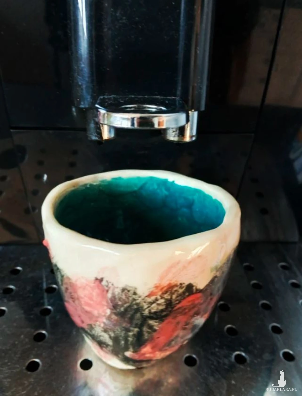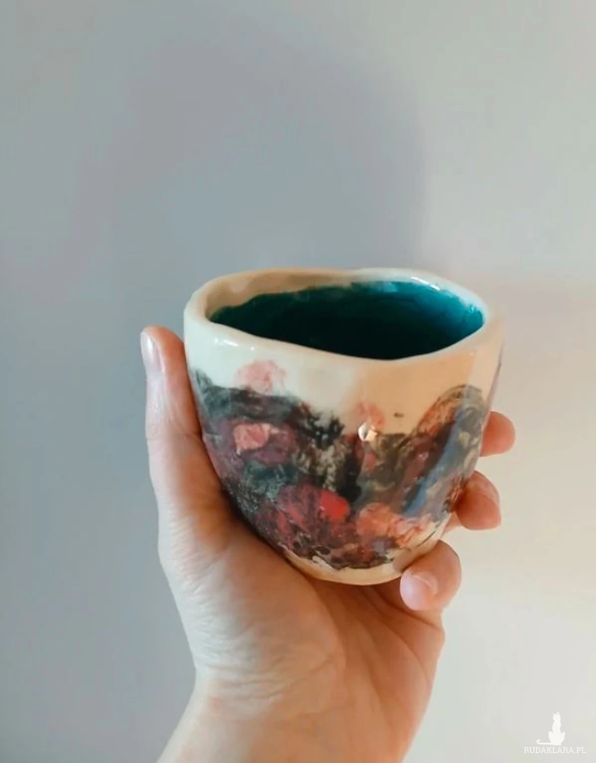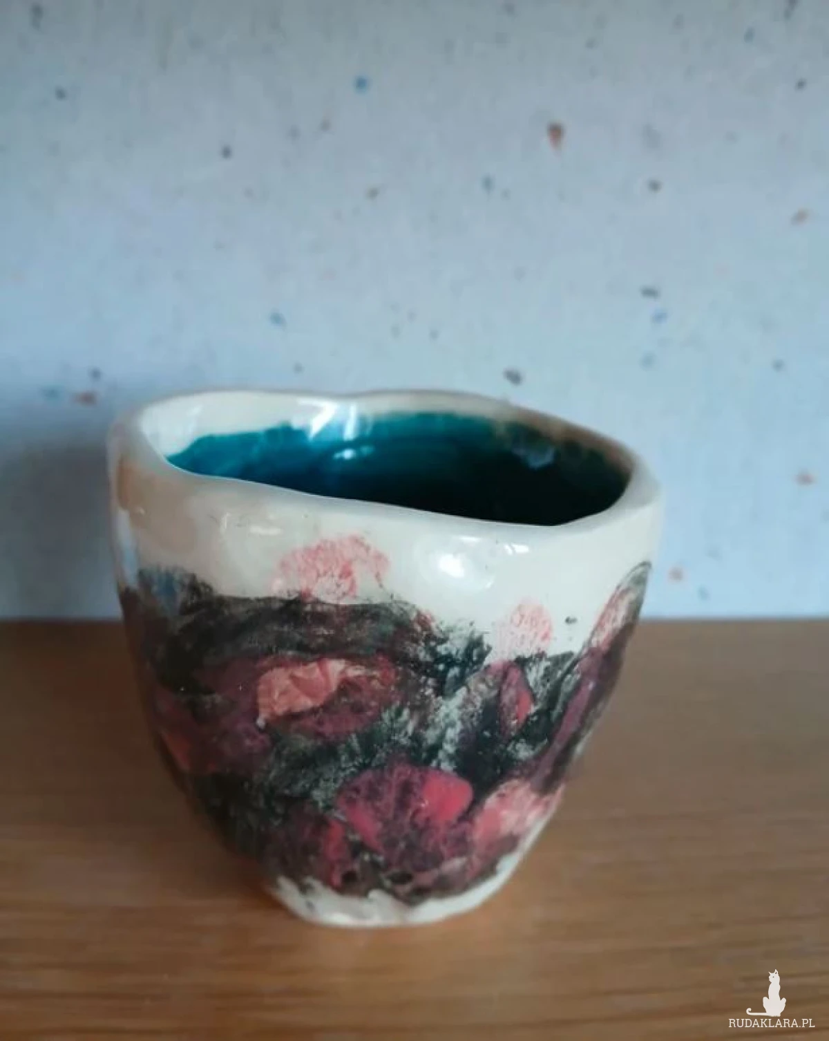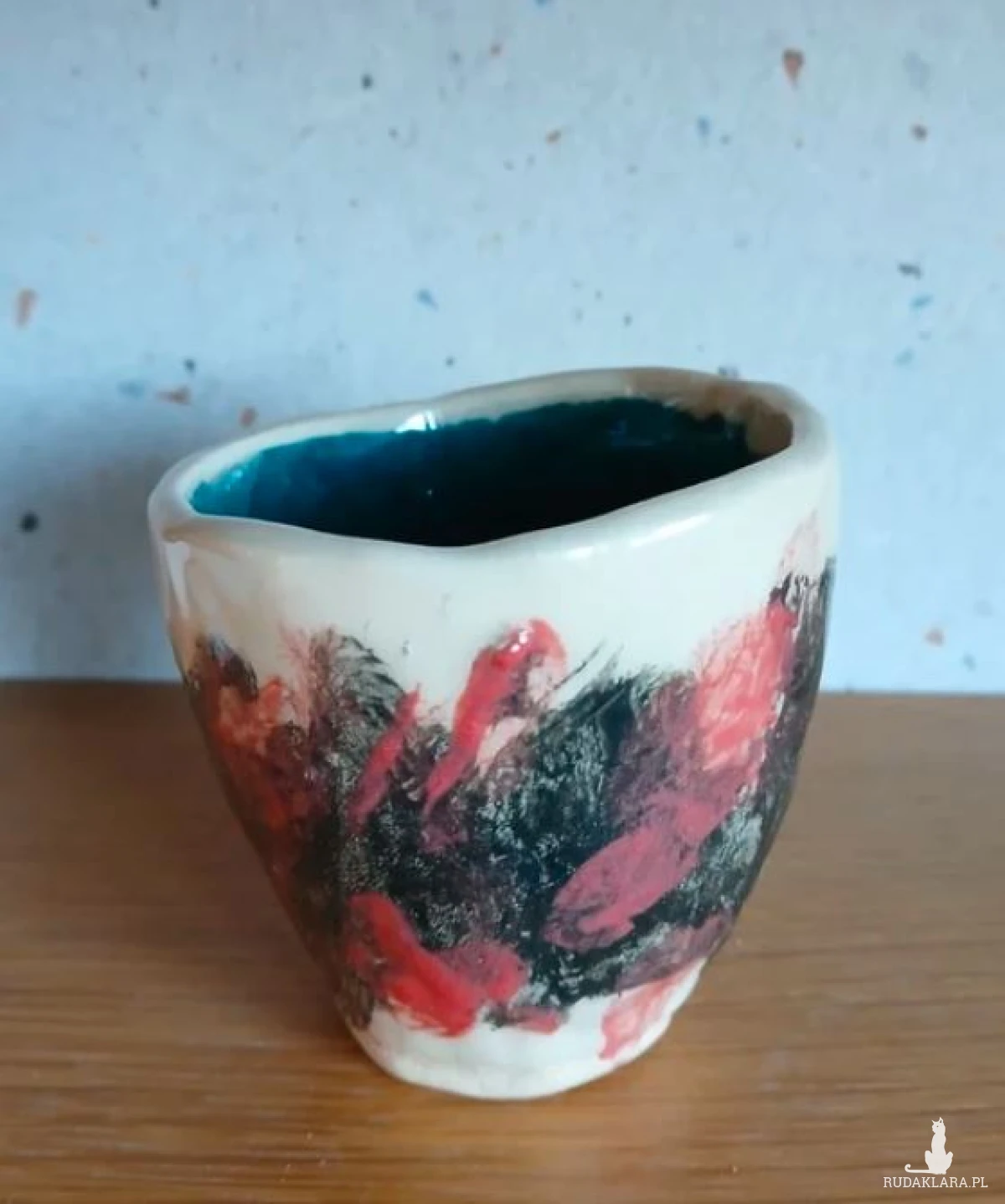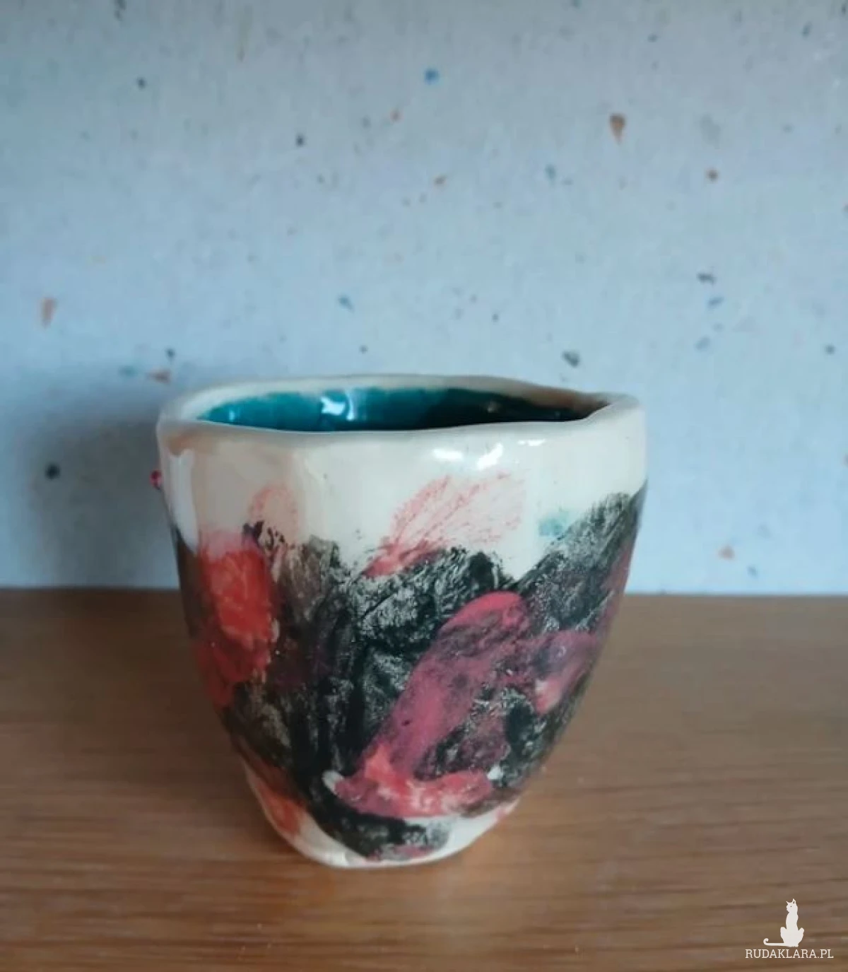 środek szkliwony ciemny turkus, z zewnątrz czarne i czerwone angoby pod transparentym szkliwem