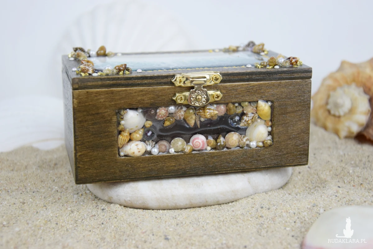 Z przodu szkatułki umieszczono dekoracyjne okienko, w którym znajduje się starannie ułożona kompozycja z muszli, bursztynów, pereł oraz elementów ozdobnych. Dla trwałości i ochrony wszystkie muszle zostały pokryte warstwą żywicy, dzięki czemu są zabezpieczone przed uszkodzeniami.