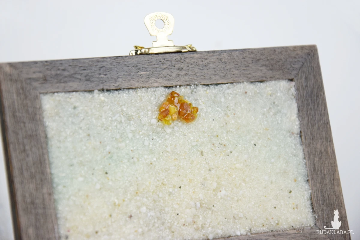 Na spodzie pokrywy znajduje się drobny piasek, na którym ułożone zostało serce stworzone z prawdziwych polskich bursztynów – subtelny i symboliczny akcent dodający całości wyjątkowego uroku. Szkatułka została osadzona na korkowych stopkach, które chronią powierzchnię mebli i zapewniają stabilność.