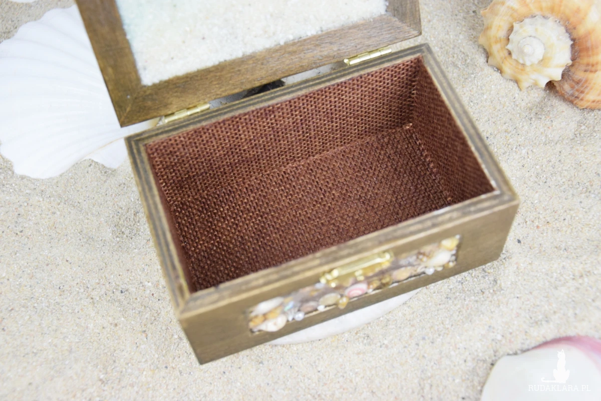 Wnętrze szkatułki wyłożono tkaniną przypominającą jutę, która pięknie komponuje się z naturalnym, morskim charakterem dekoracji.