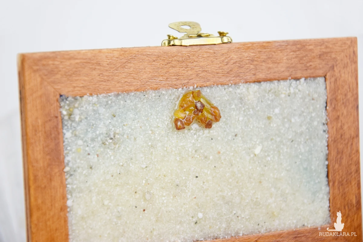 Na spodzie pokrywy znajduje się drobny piasek, na którym ułożone zostało serce stworzone z prawdziwych polskich bursztynów – subtelny i symboliczny akcent dodający całości wyjątkowego uroku. Szkatułka została osadzona na korkowych stopkach, które chronią powierzchnię mebli i zapewniają stabilność.