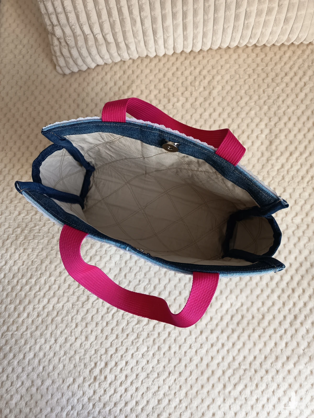 Unikatowa torba wykonana ręcznie z jeansu – dostępny tylko jeden egzemplarz. Idealna na co dzień lub spacer.