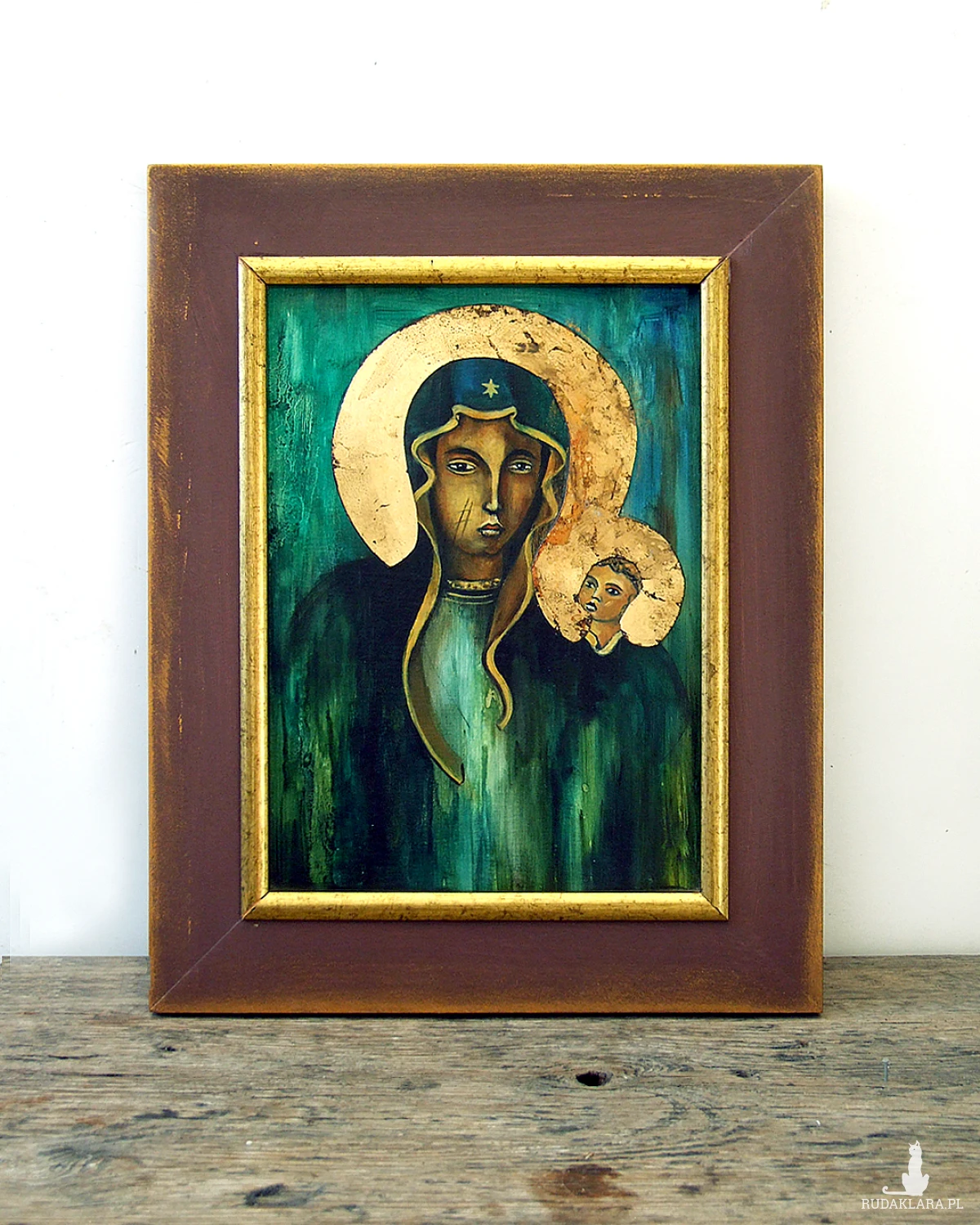 Obraz olejny malowany na płycie hdf - Madonna. Aureloe wokół postaci pokryte są złotą patyną, delikatnie odstającą od obrazu, całość zabezpieczona jest werniksem.