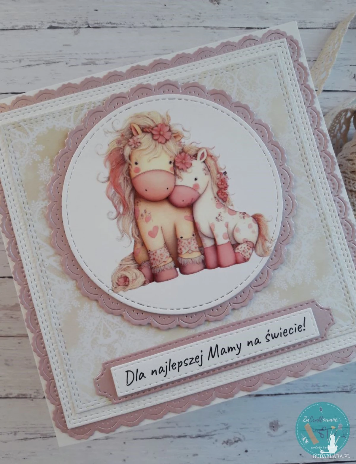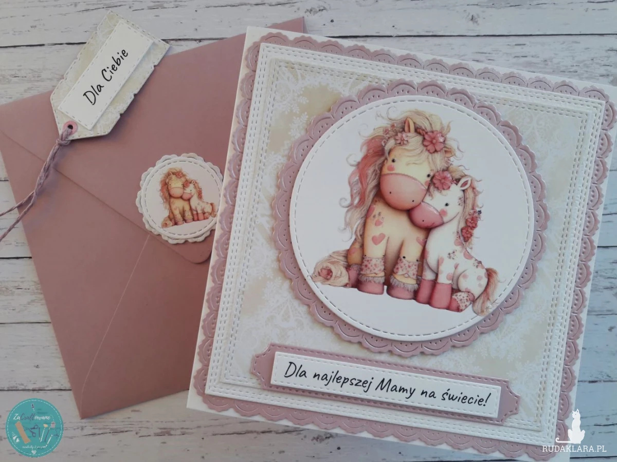 Ręcznie robiona kartka na Dzień Mamy z uroczymi konikami wykonana metodą scrapbookingu z wykorzystaniem profesjonalnych materiałów i z dbałością o każdy szczegół.