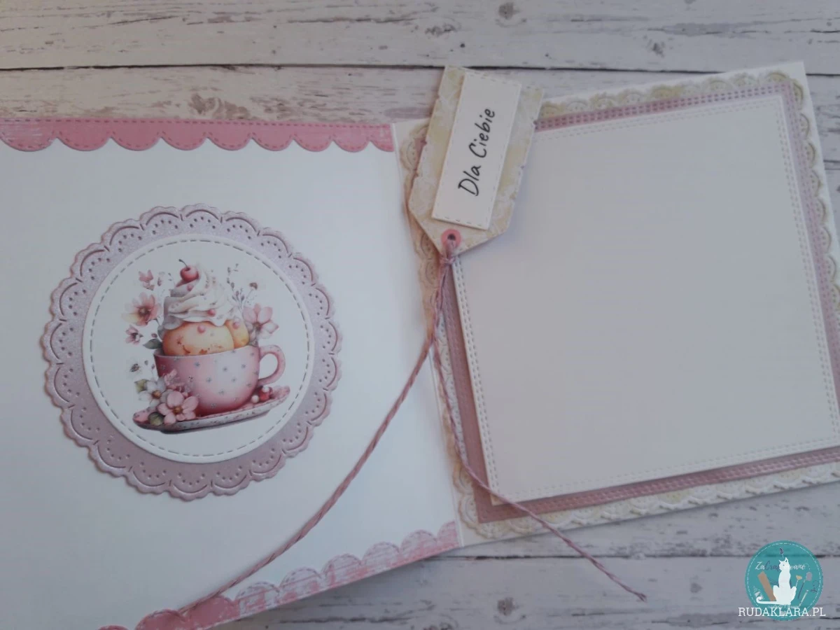 Tył i wnętrze kartki także zostały ozdobione. Wewnątrz jest miejsce na umieszczenie życzeń - odręcznych lub drukowanych. Grafika jest wykończona preparatem szklącym, który nadaje jej cukierkowy połysk.