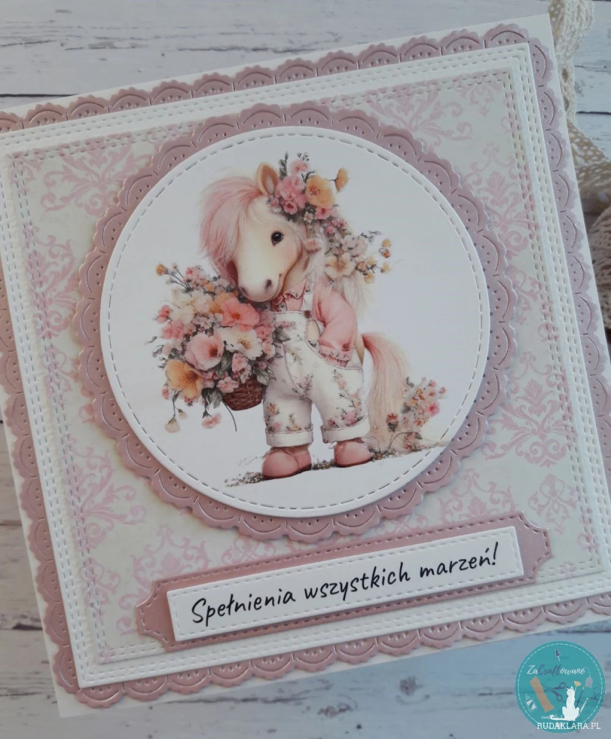 Ręcznie robiona kartka urodzinowa dla nastolatki z uroczym konikiem w ogrodniczkach wykonana metodą scrapbookingu z wykorzystaniem profesjonalnych materiałów i z dbałością o każdy szczegół.