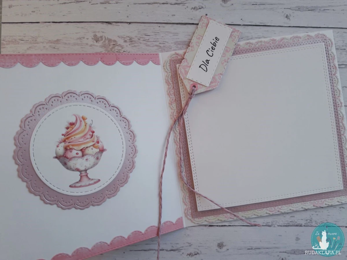 Do kartki dołączam GRATIS w postaci widocznej na zdjęciu etykietki, za pomocą której można podpisać upominek dla solenizantki i przyczepić ją do wstążki, którą obwiązany jest prezent, za pomocą sznureczka, który również znajduje się w zestawie.