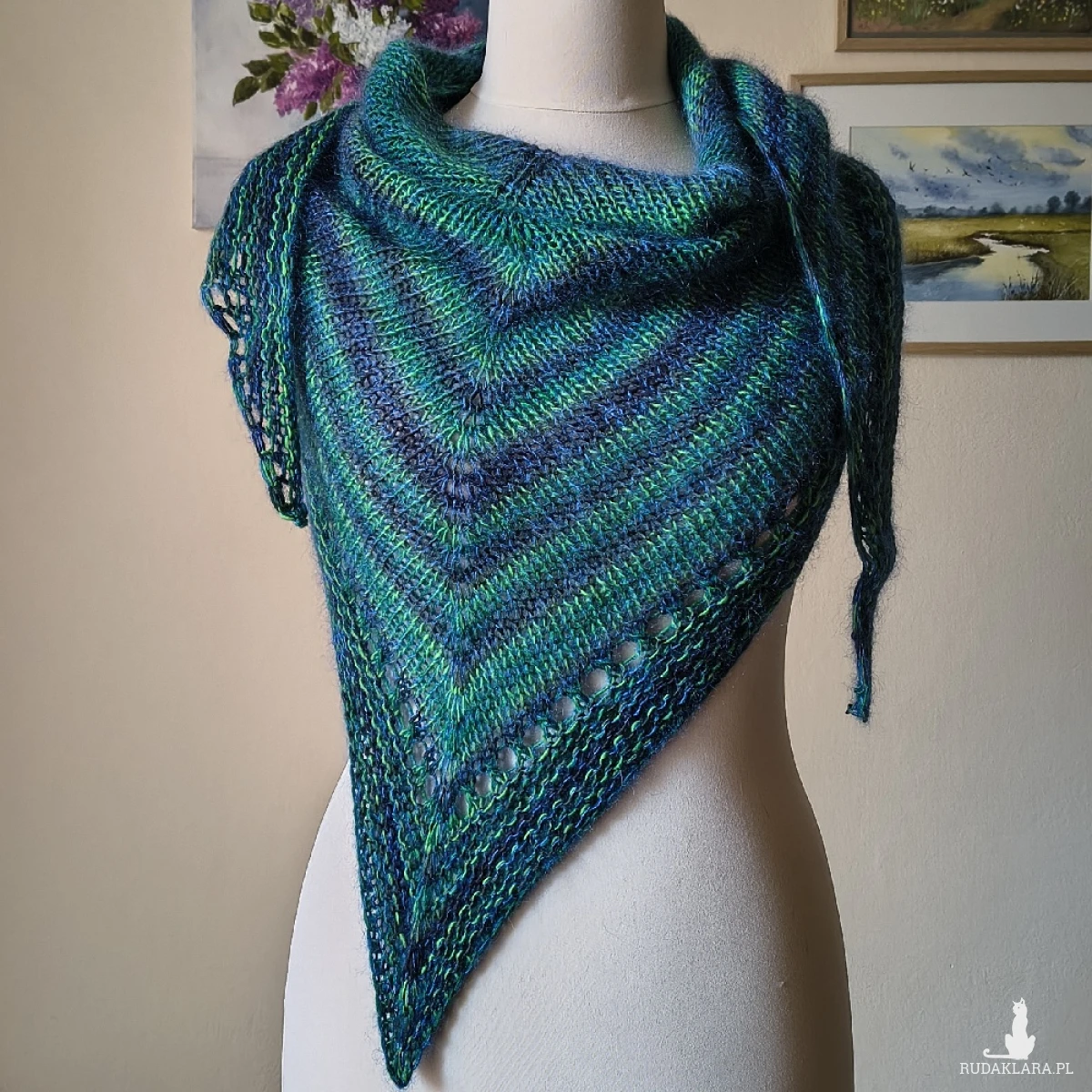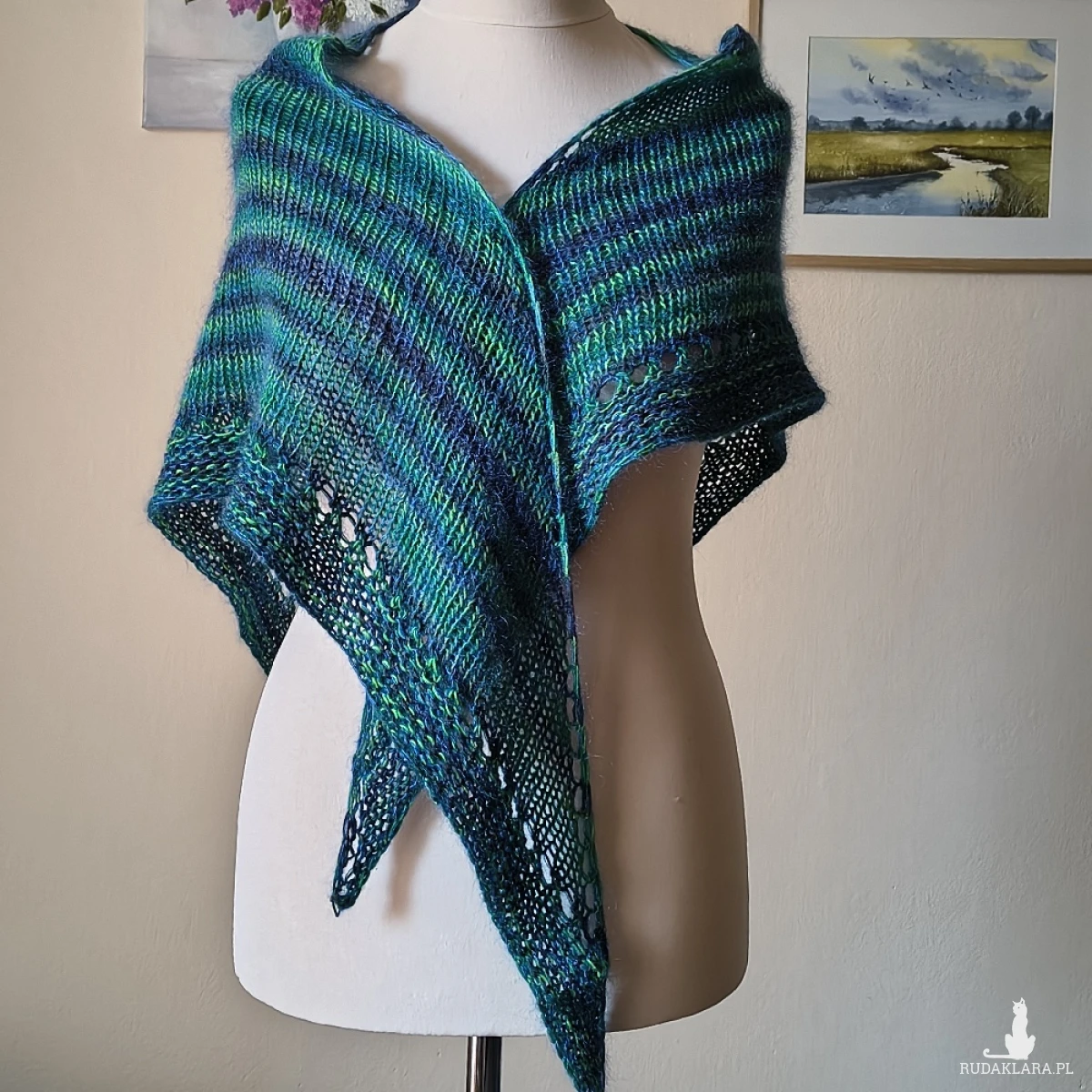 Duża ekskluzywna chusta wykonana ręcznie na drutach podwójną nitką z najwyższej jakości włóczek: cudownie miękkiego kanadyjskiego moheru z jedwabiem (75%/25%) i niezwykłej, certyfikowanej, ręcznie barwionej (niestety znacznie droższej) urugwajskiej wełenki merino 100%. Kombinacja włóczek dała wyjątkowy efekt kolorystyczny. Chusta jest bardzo ciepła, miła, delikatnie puchata i przede wszystkim lekka. Latem z powodzeniem zastąpi wierzchnie okrycie, a w chłodniejszych miesiącach będzie świetnym dodatkiem do dowolnych stylizacji. Wymiary: 202 cm. bok najdłuższy, 78 wysokość trójkąta. Pranie wyłącznie ręczne.